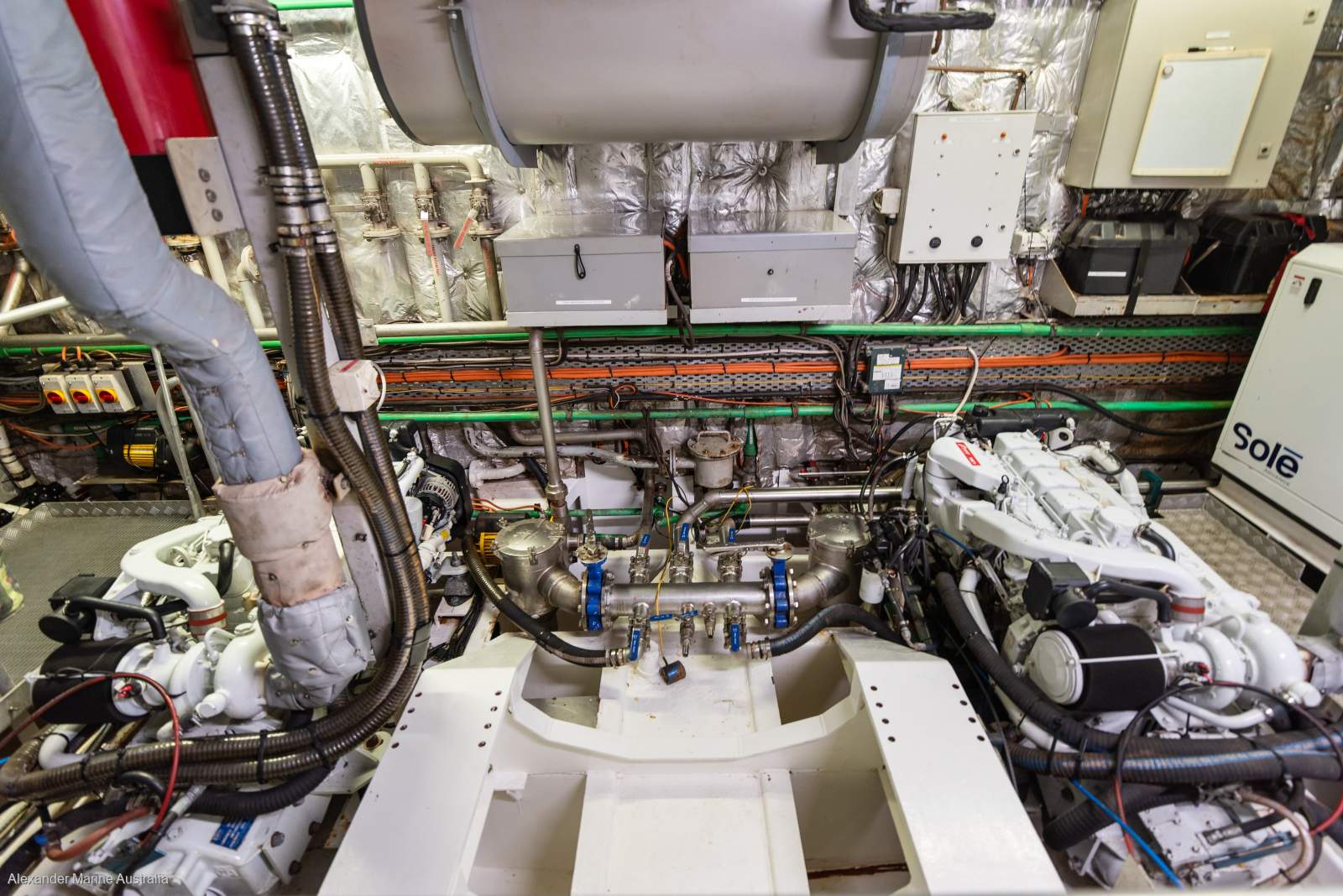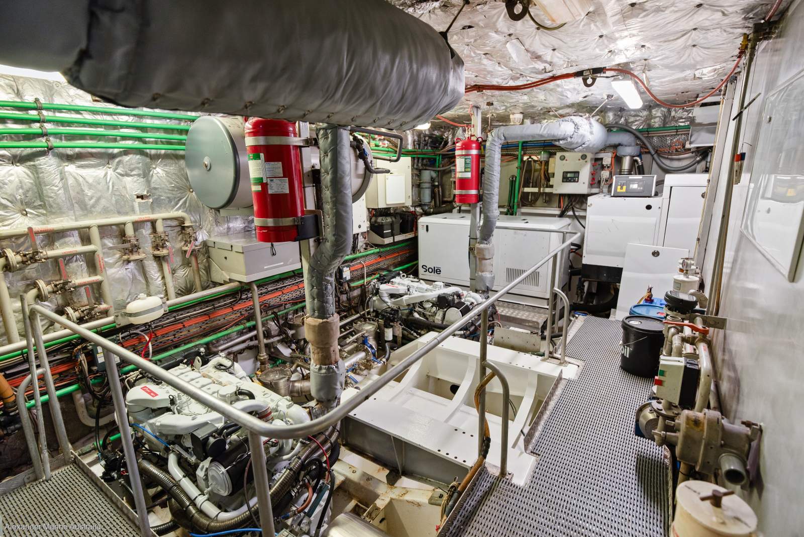 Accessed via the previously mentioned cockpit side door, the engine room houses twin Iveco FPT engines, which were installed new in recent years, supported by a late-model Solé Advance 54.5 KW generator and an additional Onan 50 KW generator. Two Sharplift water makers supply fresh water for extended passages, while the lazarette provides space for equipment and also houses a Hisense 242L fridge and 155L freezer for additional storage of provisions. Her systems are arranged for accessibility and ease of maintenance, reflecting the commitment to long-term reliability.