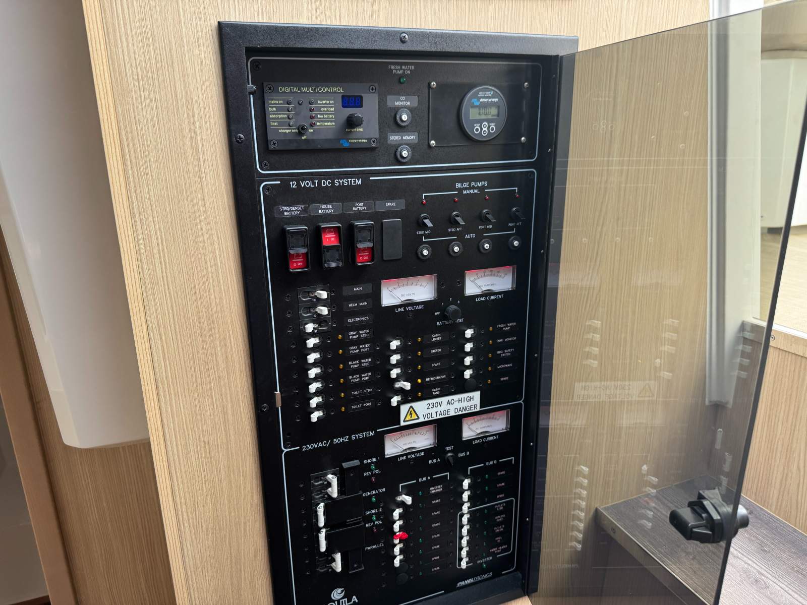 Victron 3Kva Invertor / battery charger, Victron solar controller, Victron Cebro monitoring, on board Ingternet router (just change the sim), Windlass 1000w with handheld control, Spot Light & remote mounted at the helm, underwater lighting 4 x blue Led & Premium blue LED deck lighting package, Fusion Audio system with 6 speakers