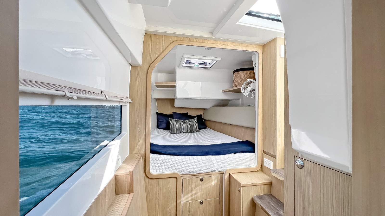 There's nothing like it in its class, because it's an outboard powered sports catamaran - it's fast, it's reliable, it's stable, it's beamy, it's versatile and it's easy to handle with wide-set twin Mercury V8 300hp outboards with joystick piloting with the Hydro Glide® Foil System - providing greater fuel efficiency and a much smoother ride.