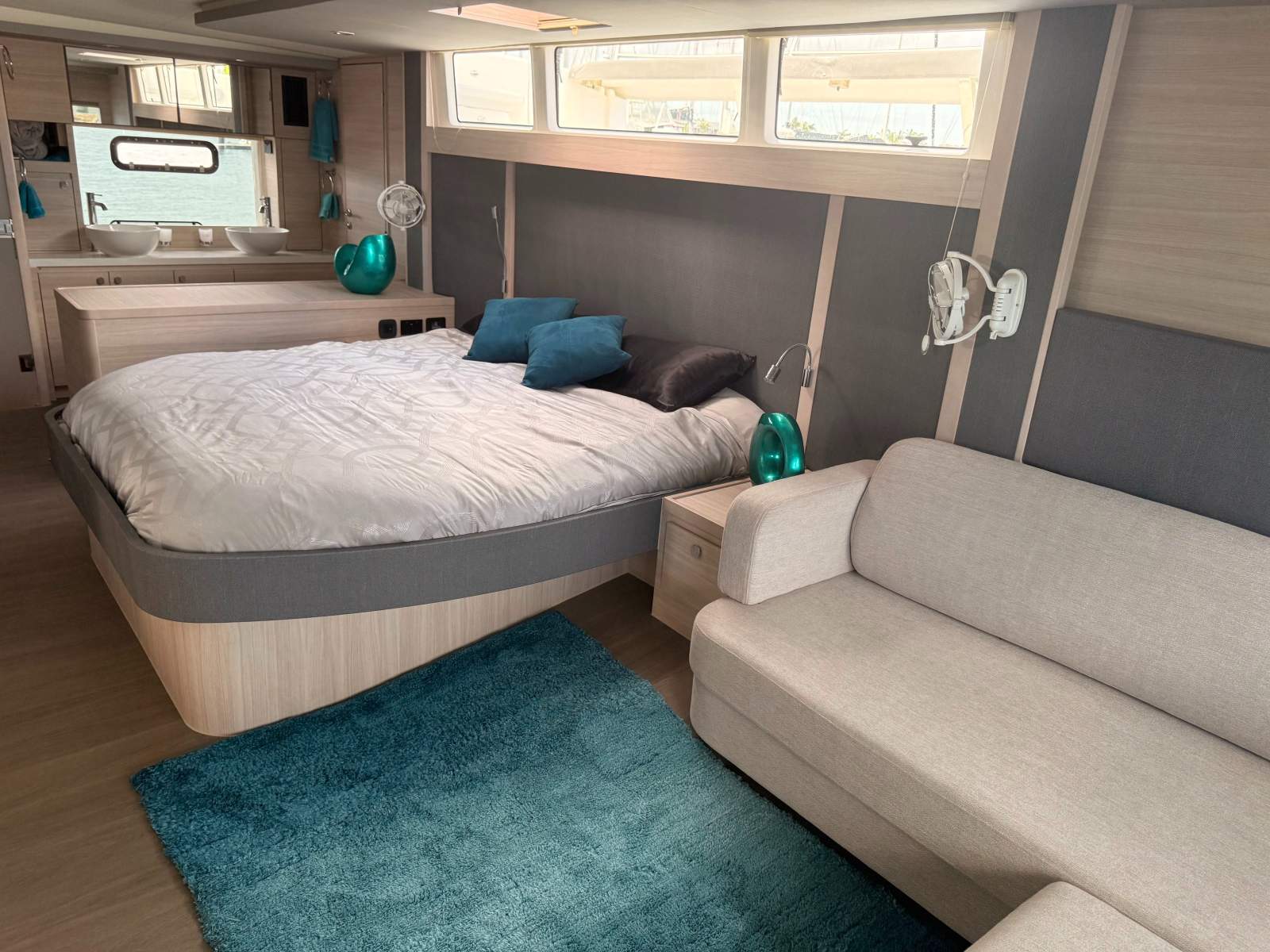 Three cabins are accessed directly from the saloon, including a full-beam owner's suite with ensuite bathroom, separate shower, walk-in wardrobe, and 50-inch TV. Two additional double guest cabins feature centreline island beds, generous storage, private ensuites, and electrically lowering ceiling-mounted TVs.