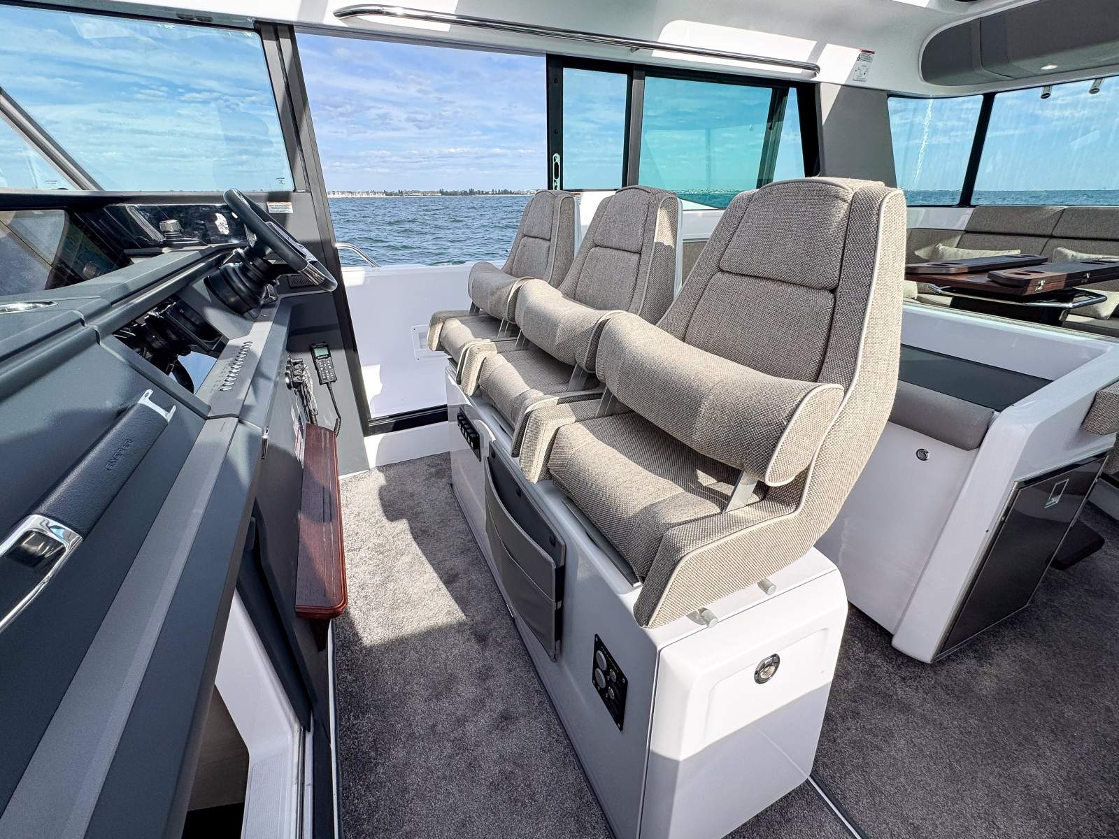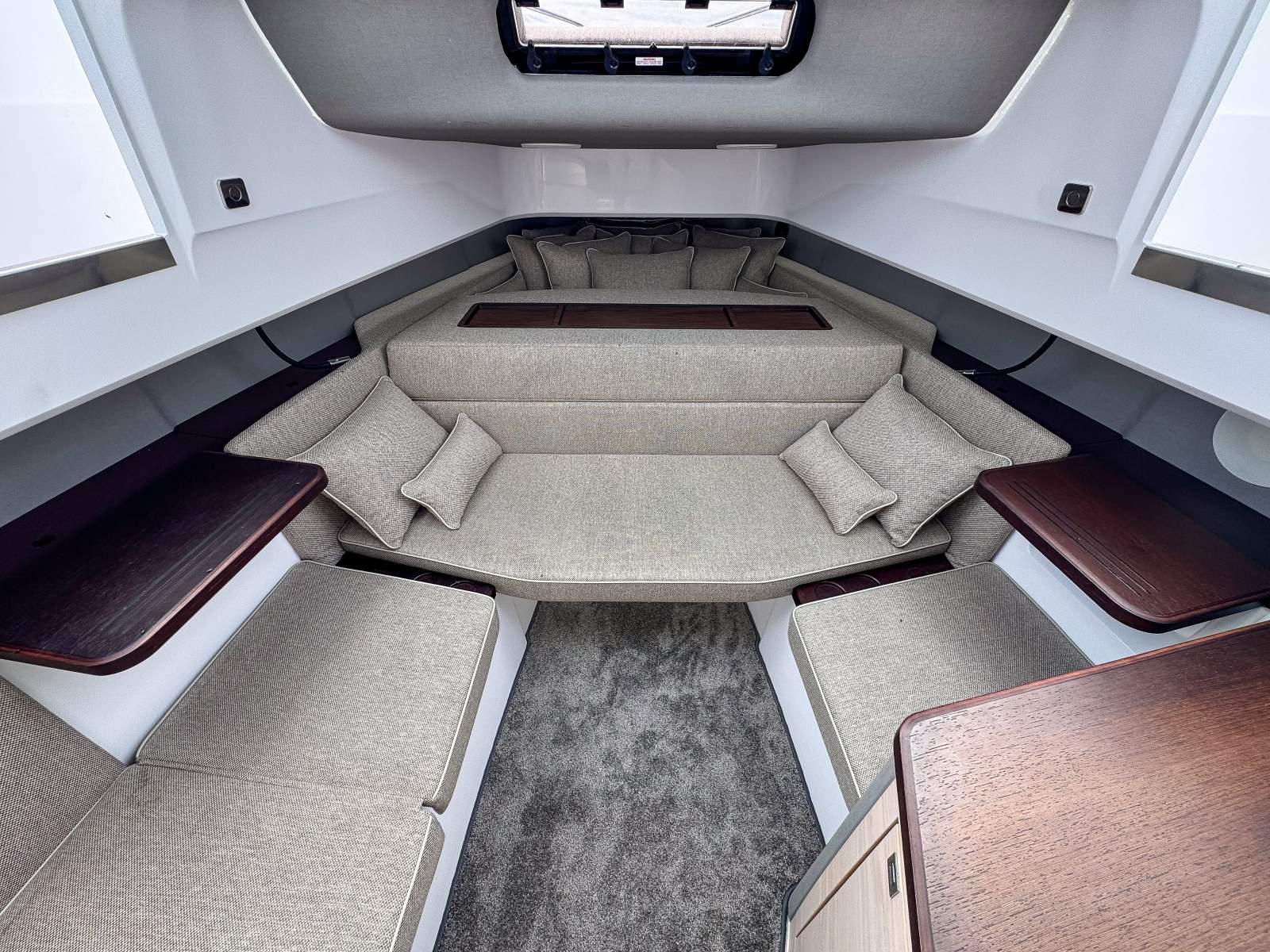 Step inside the fully enclosed cabin, where dual sliding doors create an easy flow between the saloon and outdoor spaces. The U-shaped lounge with a removable table is ideal for meals or entertaining and the dual electric canvas sunroof opens the space up to the sea breeze when the weather's right. Sunshades to the forward and aft decks make long days on the water even more enjoyable.