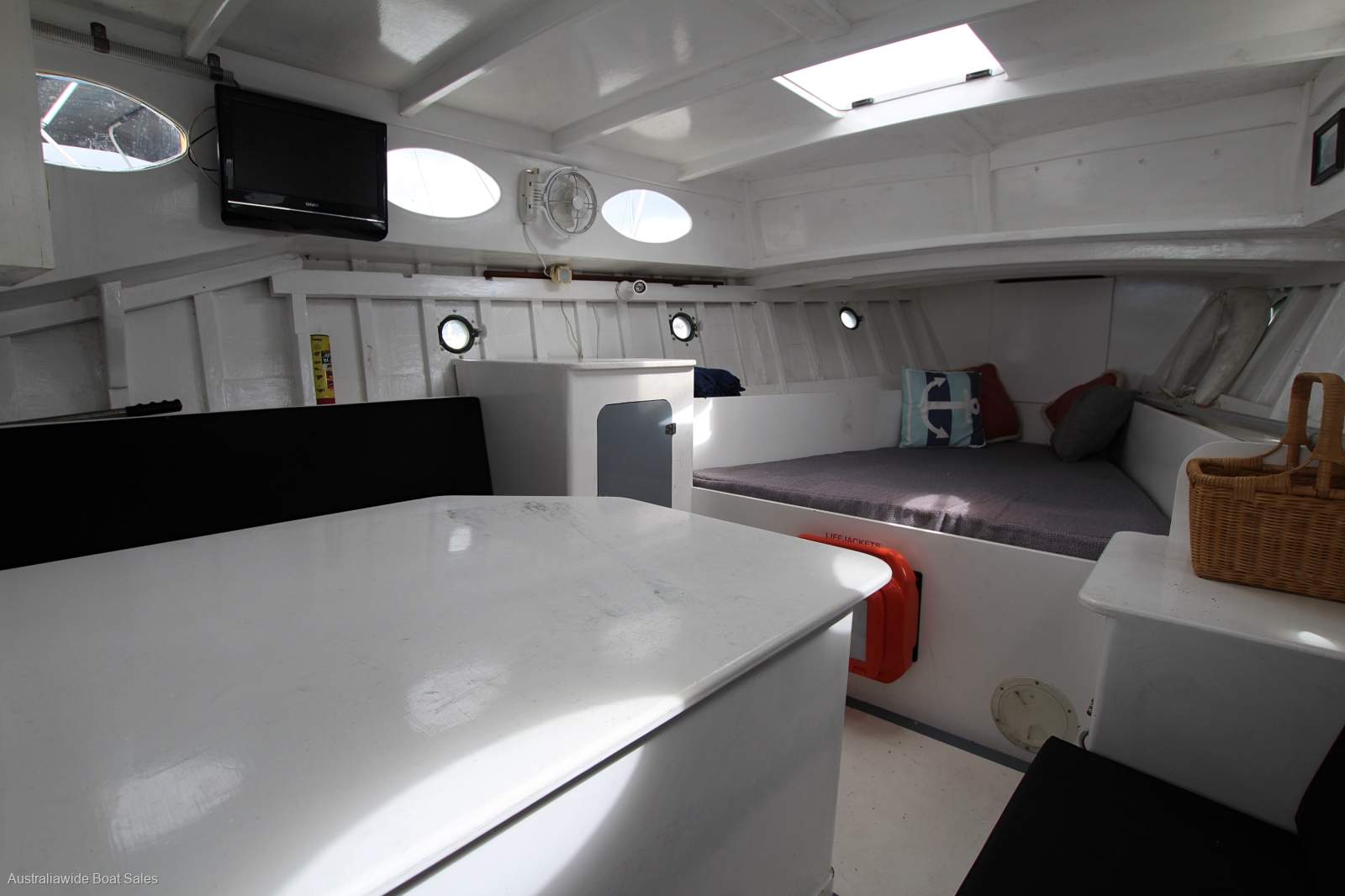 Island Girl offers a spacious open plan interior with plenty of natural light and ventilation whilst offering a solid rear deck cover and good awnings. A compact galley, enclosed heads - no holding tank but there is also a port-a-potty for compliance and and an interior shower. Plenty of new electronics and water heater, LED lighting and a 55hp Yanmar in superb condition. Nimble and easy to handle she cruises comfortably at 7 knots and can get to up 12 knots at a pinch. Her current owner is relocating and unfortunately has to leave her behind. To arrange an inspection please call Australiawide Boat Sales in Manly Qld.
