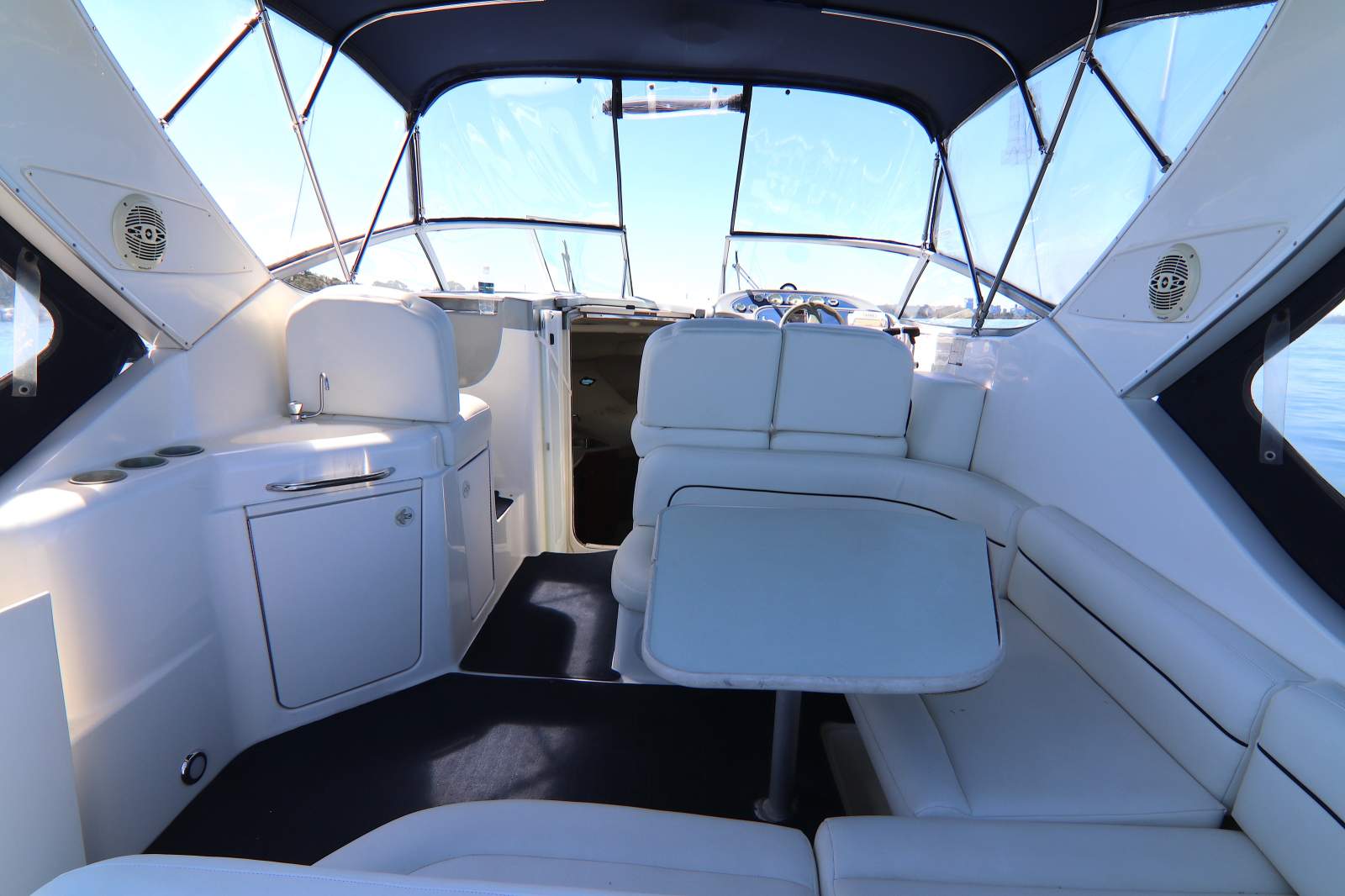 With only one owner since new, this stunning and original sports cruiser has always been kept out of the water and has gleaming Gelcoat as it has never been anti-fouled. The twin V8 Mercruisers have an impeccable service history with new manifolds and risers in 2023 and are flushed after every use. The cockpit has loads of seating with the vinyl in perfect condition and the full camper covers present as new. The timeless interior is as it left the factory with a functional galley and a spacious bathroom with a holding tank for the toilet. The dinette converts to a large single bed, complimenting the forward V-Berth double and mid-ships cuddy cabin double. There are a few minor updates required including the GPS unit and bedding trim but with the Air-Berth included, this complete package represents excellent value. Fully serviced by Matich Marine in August 2025 and showing only 125 hours of use. (Suite SeaRay, Mustang, Sunrunner, Fourwinns, Maxum buyers).