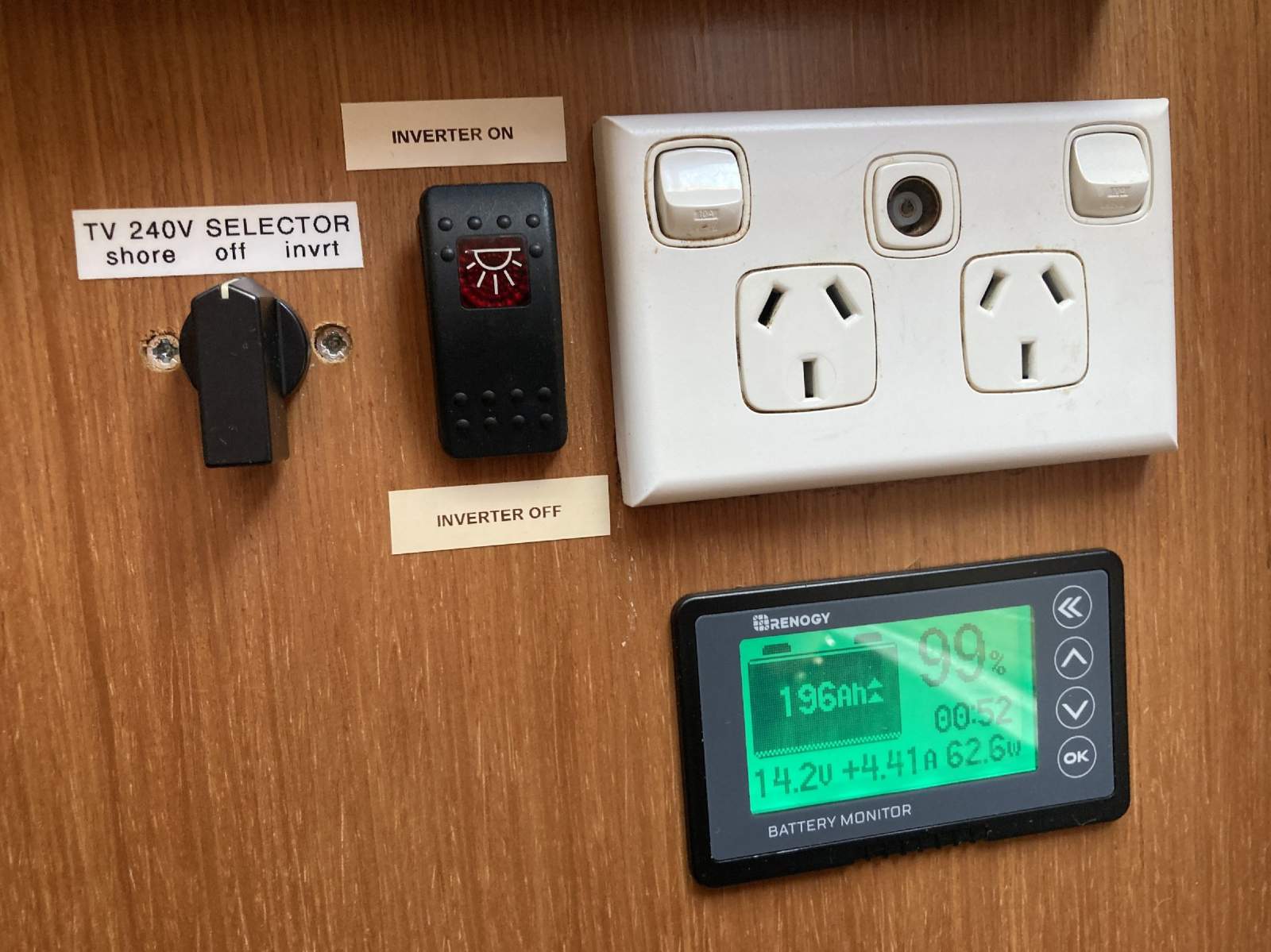 240v Shore power - 12/240v Inverter - Battery charger - Solar panels & monitor - Cockpit flood lights - Jabsco remote spotlight - Windscreen wipers & washer
