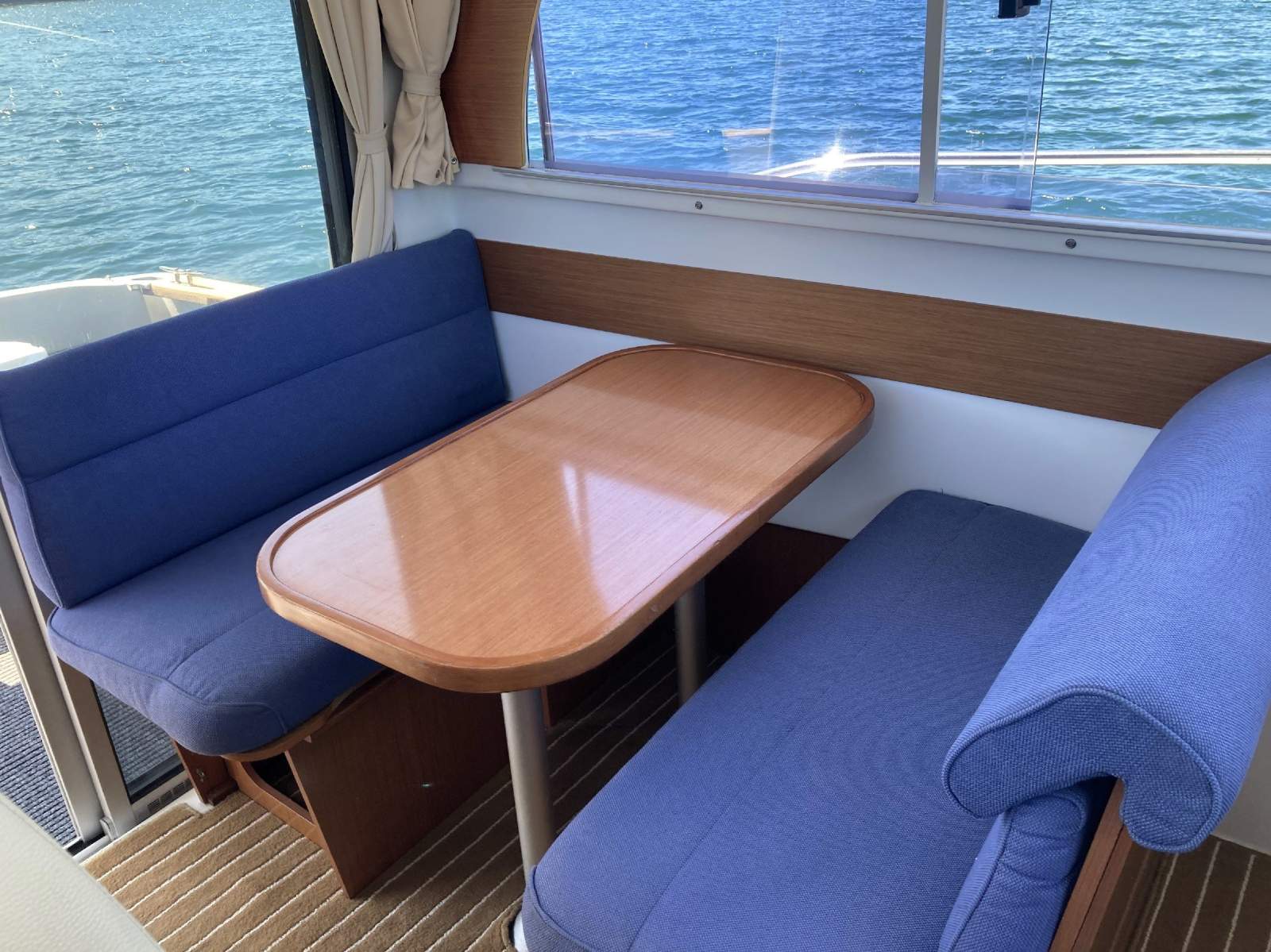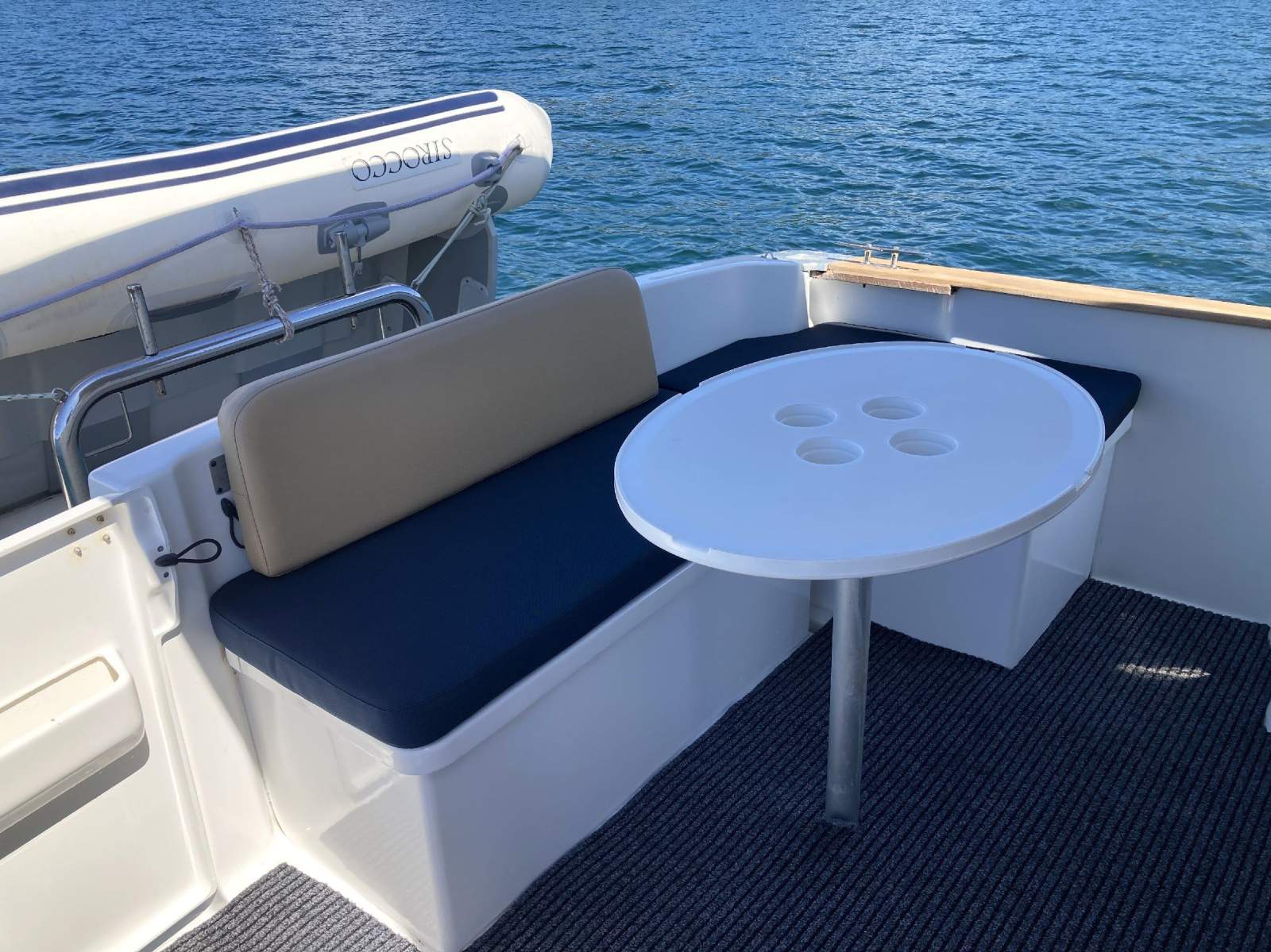 Walkaround decks - Cockpit lounge seating with removable table - Cockpit Teak covering boards - Teak laid swim platform - Swim ladder - Stainless steel transom rail - Stainless steel bait board - Transom door - Fenders & boat hook - Engine & boat spares
