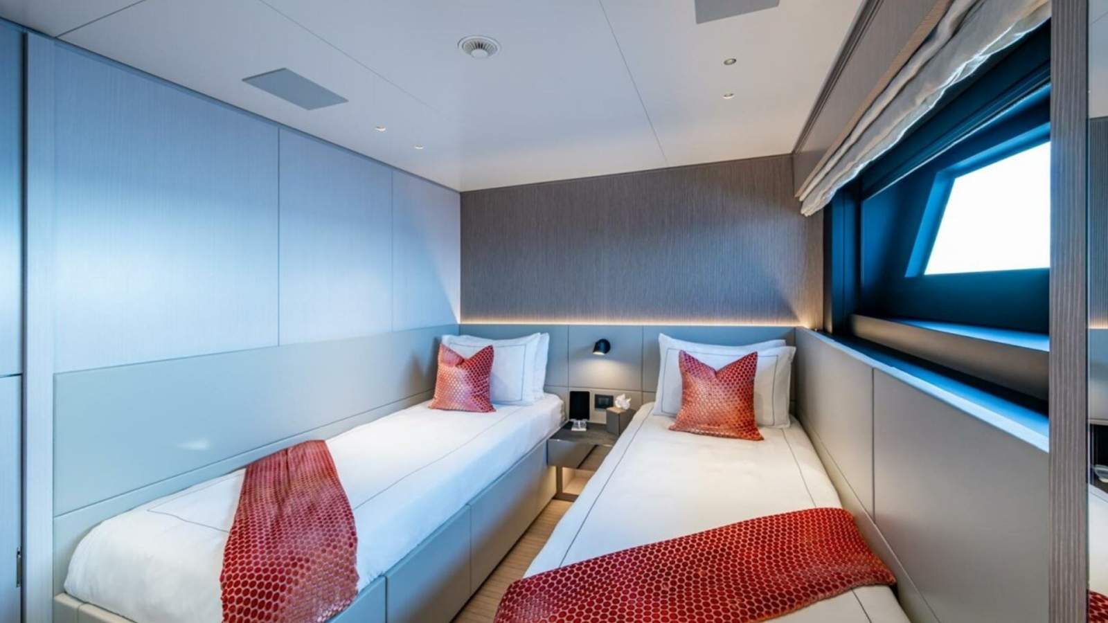 The full beam on-deck master stateroom is a private sanctuary with panoramic hull-side views, walk-in wardrobe, and a luxurious his-and-hers marble bathroom. Below deck, four additional guest cabins provide five-star comfort, including queen and twin configurations with ensuite stone bathrooms, entertainment systems, and climate control.