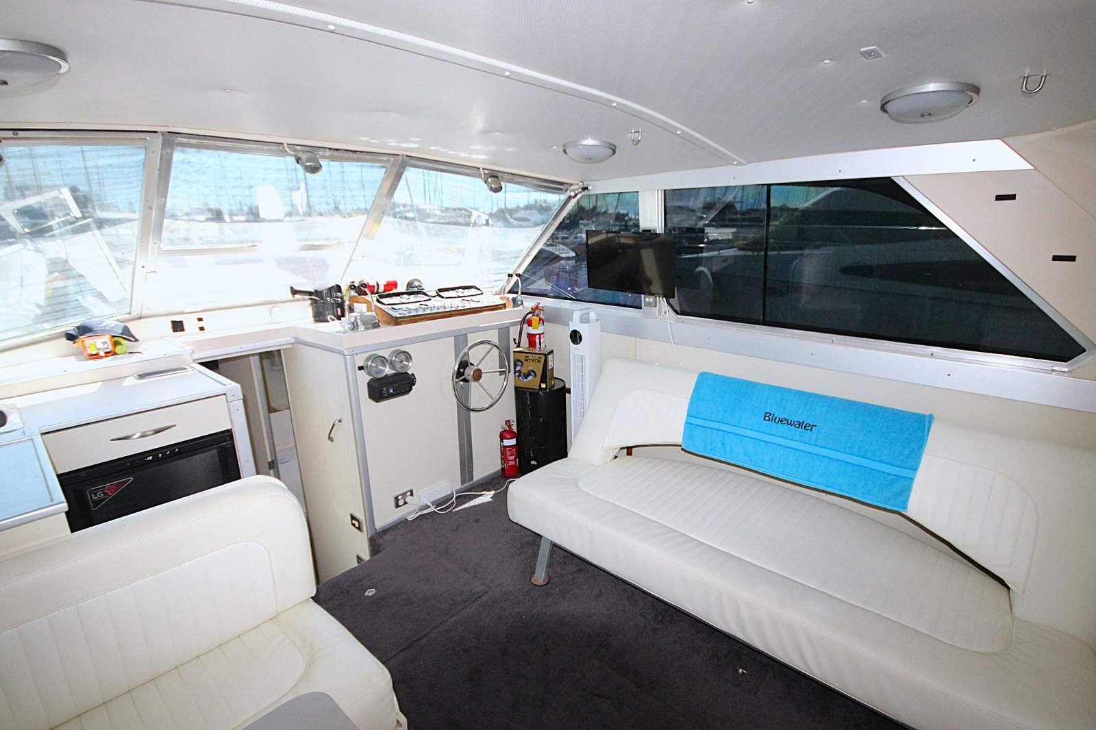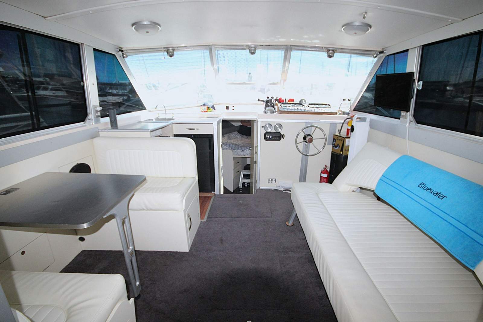 Powered by a pair of Mercruiser 7.4 V8 petrol shaft driven engines thats seem ctidy enough with the limited room I had to get into the engine bay. Hours are unfortunately not available as the hour meters are not a true representation of the actual hours. She has twin 600 lt tanks onboard but is currently only operating on the forward tank. All tanks are operational but a suggestion to flush the rear tank might be a good idea as it has not been used for some time.