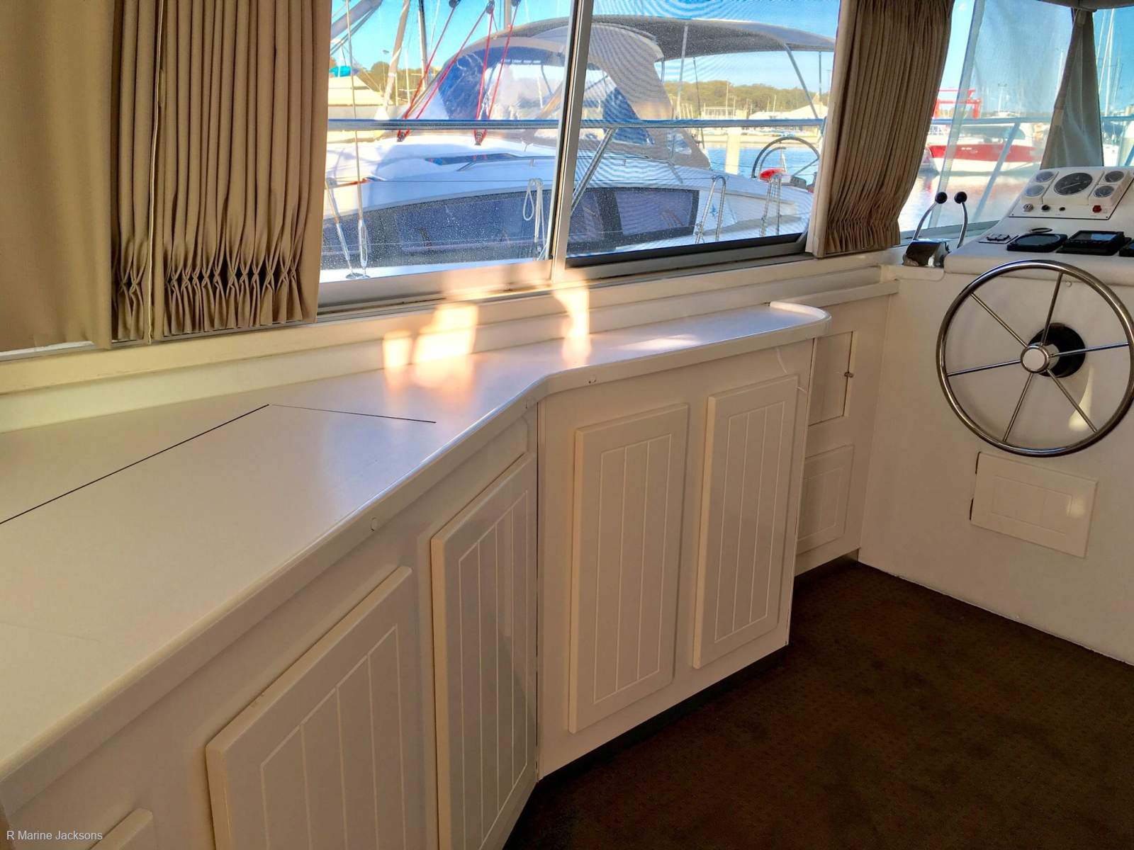 White 2 pack painted solid surface facia in saloon & galley