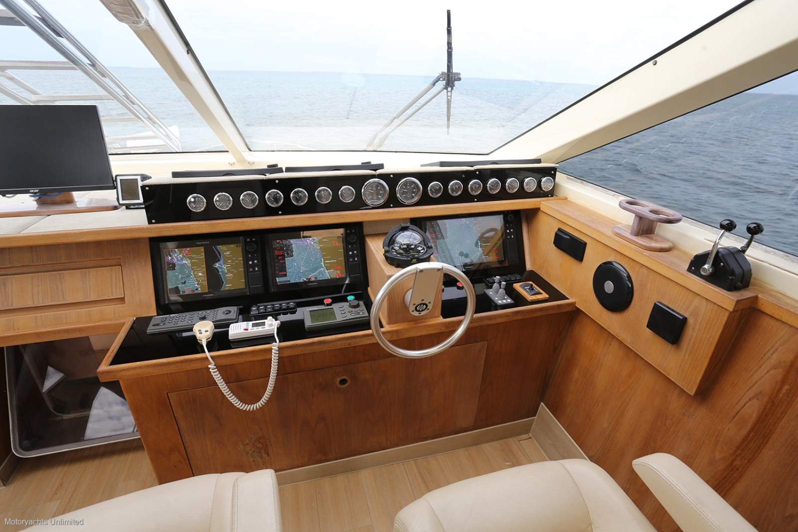 There are two helm stations fully equipped with some of the latest electronics and multifunction displays. The wheelhouse is so large it could almost be an additional cabin. Located beneath is the lower full beam helm station with duplicate screens. Port and starboard sliding doors provide ventilation but more importantly immediate access to the side decks for vision and ease of berthing.
