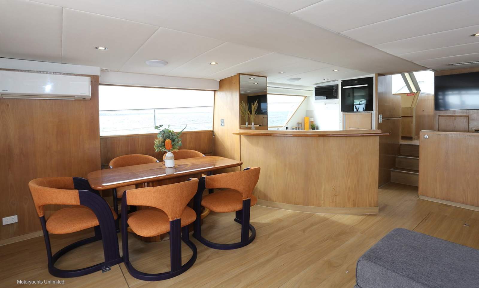 Her main saloon is full of light, a vast area with integrated galley equipped with all of the normal appliances - very much a social arrangement. This is the place where everyone can congregate once the sun goes down to share stories of the days adventures.