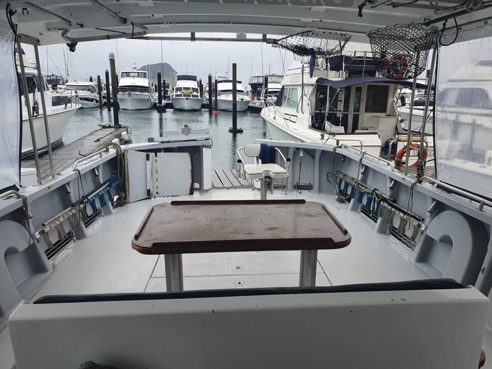 Commercial Style, ex surveyed, GRP construction, built by Channel Craft Australia, launched 1979. Powered by 420hp Scania diesel. Bow thruster, Auto anchoring, game rigged, game chair, live bait tank, line peeler, small hold, dive bottle holders, cockpit controls, large covered self-draining aft deck, dinghy davit, battery charger, shore power. Electric toilet/shower off cockpit, 12v fridge, 2 burner/oven, 5 single berths. Electronics include VHF, GPS/plotter, C-map on screen, fishfinder, depthsounder, AP4 autopilot, radar, stereo, TV. A great boat for fishing and diving with the roomy covered cockpit. Would sell 12m Sulphur Point Marina berth if required.
