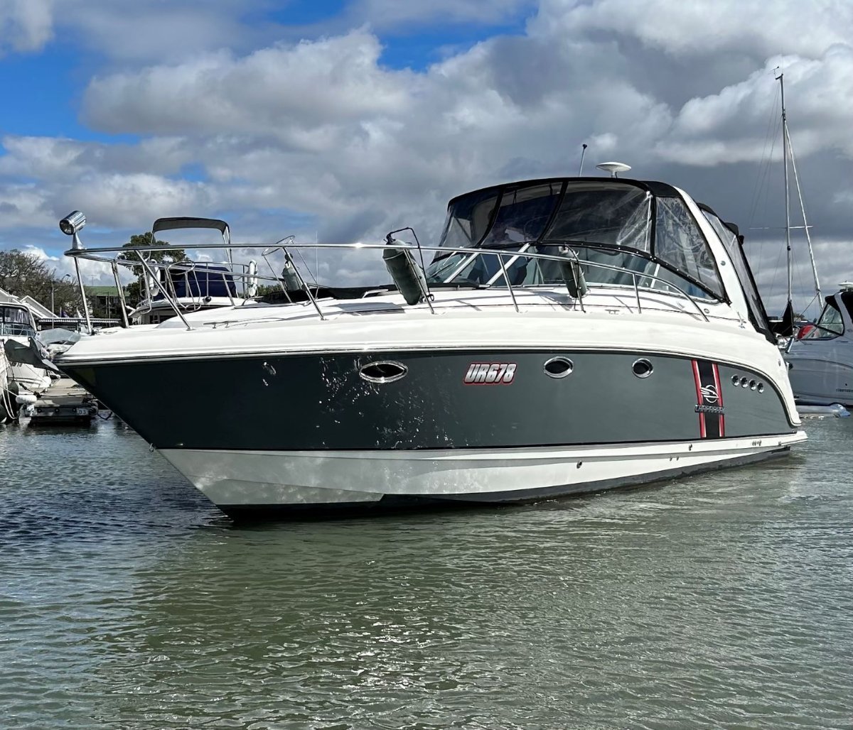 Chaparral 377 Signature Sports Cruiser, 2006, Twin Cummins Diesel 320 HP, Bravo 3 stern drives, highly optioned and nicely presented with several recent upgrades and major engine out maintenance works. The standard features list is extensive, as is the options list with bow thruster, generator, aircon /heating, ducted vacuum, stern rail with BBQ and bait board, upgraded Garmin 12'' GPS/Sounder, under water lights, dockside water inlet and heaps more! This boat is two pack painted in a modern grey and has had extensive works undertaken over the last 2 years to make it one of the best examples you will find. Other extras include, remote spotlight, electric anchor winch, 3 x TV's, Fusion stereo with helm remote, cockpit carpets, teak and holly saloon flooring, vacuflush head, bow sunpad, 3 x digital T. V's, cockpit fridge, and still so many other options we can't list them all here. This is a big volume, beamy cruiser with a proper island queen bed as the main and a second double in the convertible aft lounge, both with privacy doors (not just curtains) the saloon settee also converts to a large single. The galley is comprehensive with a large 12/240 fridge, microwave, twin stove top, large bench space and good cupboard/pantry storage. The storage in general is plentiful throughout and headroom downstairs is impressive at 1.98m. The head is also bigger than average with a separate shower and plenty of elbow room. In the cockpit the helm set up is very social with a twin bolster helm chair and a 3-passenger side lounge so that the skipper can have crew at his level and remain part of the social action while underway, the lower cockpit section seats 6+ people and a has a removable table that also converts to a sun bed. The swim platform has Seadeck matting and a swim ladder. Overall, this boat represents excellent value particularly with the economy and range of the diesels and the work undertaken to modernise the boat and its systems. Of Course, Chaparral's 'Saltwater Tough' DNA is the icing on the cake - with Kevlar reinforced variable dead rise hull, tasteful finishes, quality fittings and a great layout as you would expect from one of the worlds most awarded boat builders. NB: antifouled and serviced August 2025
