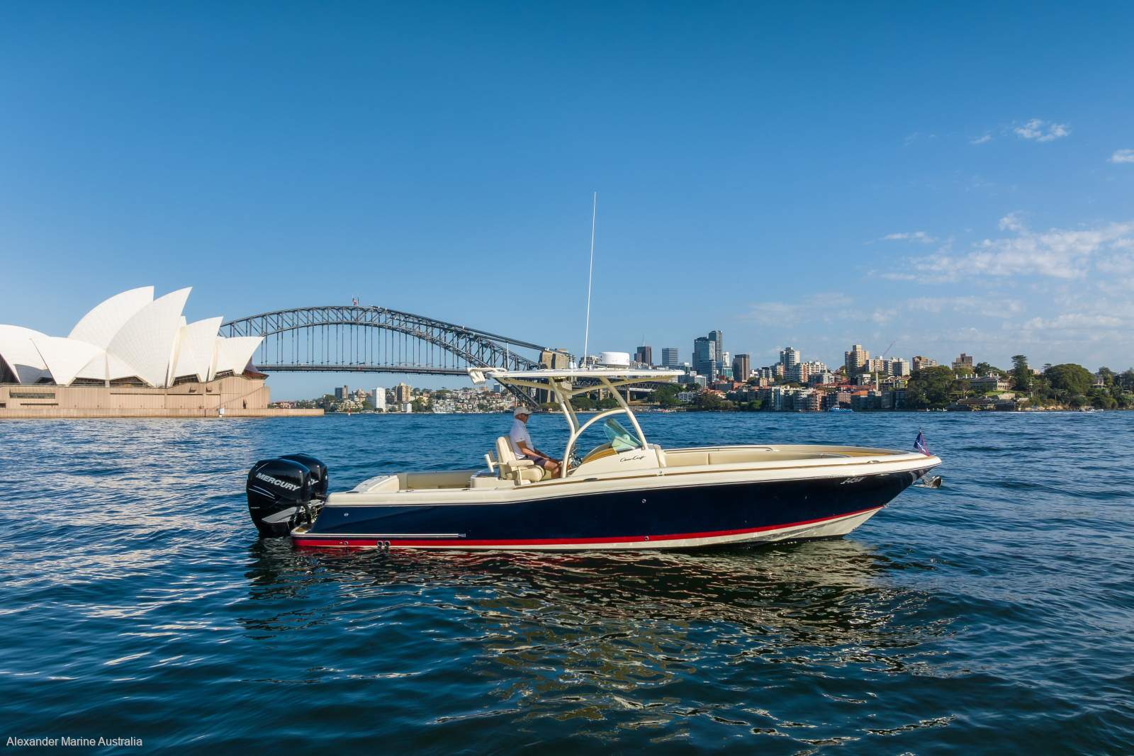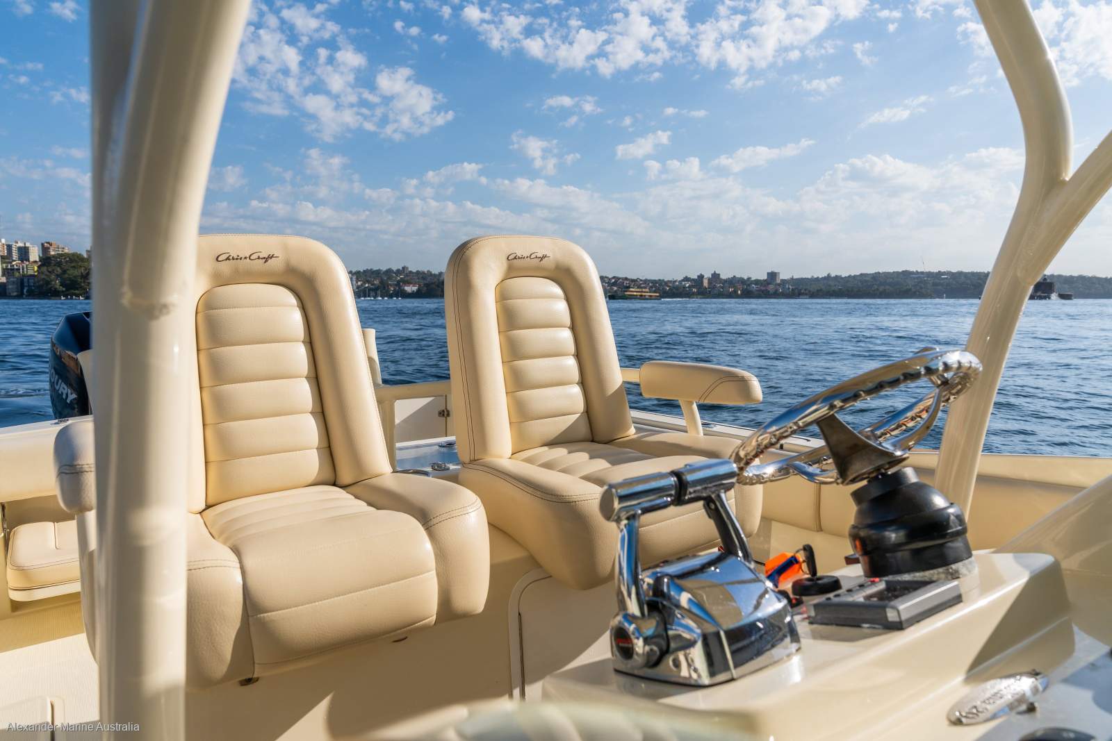The Chris Craft Catalina 29 Express is a sleek and versatile centre-console sports dayboat, combining classic Chris Craft styling with modern performance and practical functionality. She showcases enhanced teak accents and timeless detailing beyond the standard finish, including rich teak trim to the swim platform, helm footpads, and console features, delivering a warmer, more traditional aesthetic that pays homage to Chris Craft's storied design heritage.