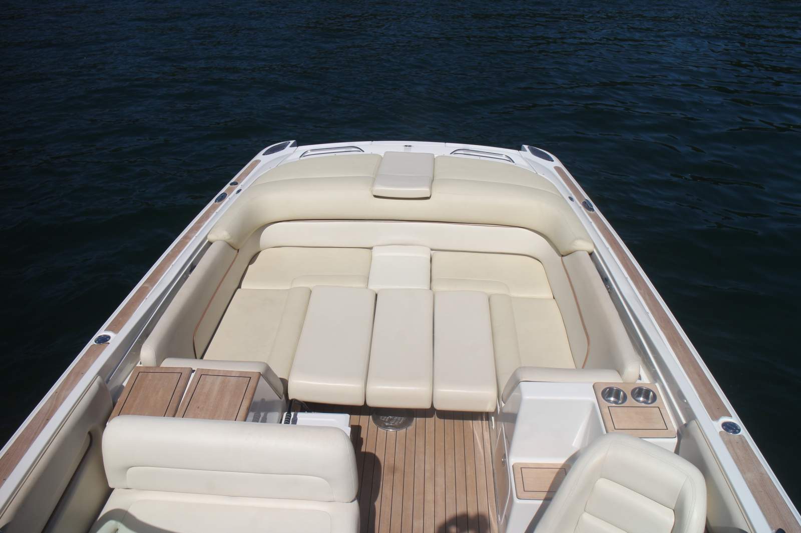 Stainless steel cleats and grab rails, teak foredeck and cockpit, teak swim platform with boarding ladder, cockpit table, transom shower, sunpad and custom forward sunbed, fender and line storage.