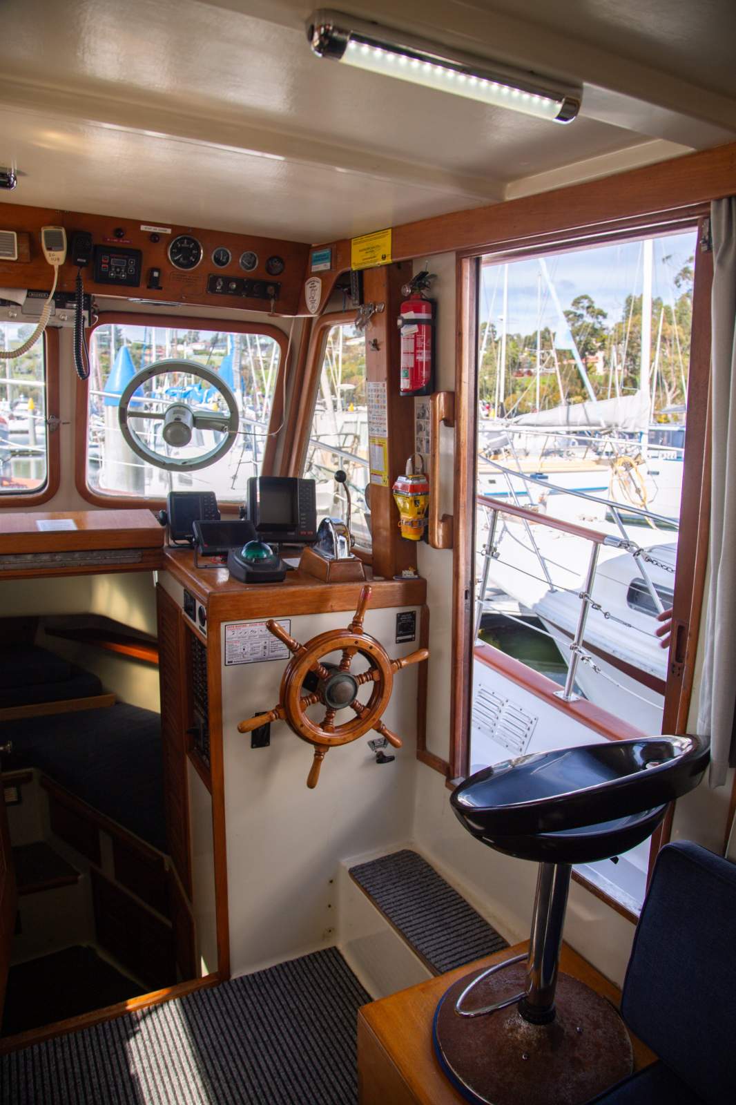 Stepping inside, the traditional timber trims and clean white finishes create a warm and welcoming ambience. To starboard is the generous timber dinette, with seating for 6 in comfort on the newly re-upholstered settee. Opposite is the well-appointed galley. With panoramic visibility this is a great space to create meals onboard. This features a 2-burner gas stove with grill, upright gas/electric fridge and freezer, stainless steel sink with H/C pressurised water, and plenty of storage, while a deep chest-style icebox sits beneath the port-side bench settee. Forward is the internal helm station. Fully equipped with quality electronics, full engine controls, and excellent visibility, this is a great place to drive from in any weather, while a terrific side-access door makes for easy handling. The impressive accommodation is a major feature of the design and would be the envy of many larger vessels. Ideal for cruising with family and friends, the vessel boasts a generous master cabin aft with two double berths, a full ensuite with a NEW (2025) electric toilet, shower, and vanity, and private access to the aft deck. The second private cabin is forward and includes a V-berth which can be utilised as either two single berths or a large double with an in-fill, and a second full ensuite.