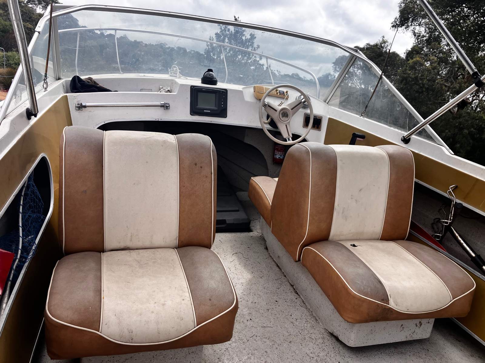 I've had this boat for 18 years and bought it off the guy who had it from new in 1980, so there's plenty of love and care that has gone into this boat. The design is so retro cool with two-tone mustard and cream back-to-back seats and original steering wheel etc. It comes with all the safety equipment including oars, life jackets, steps, first aid kit, fire extinguisher, spare propellor etc etc