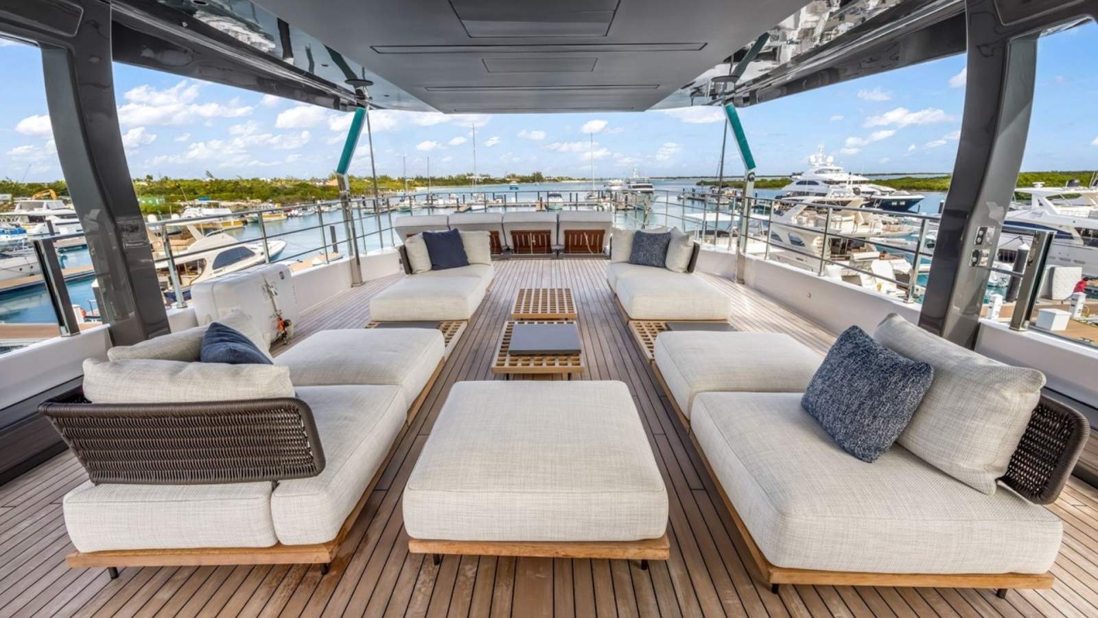Inside and out, her custom configuration was designed for elite, uncompromising comfort for up to 10 guests. Standout features include a spectacular drop-down electric balcony off the main deck, a sprawling sun deck complete with an extended Jacuzzi pool and Teppanyaki grill, and an incredible Invisible Black marble upgrade sweeping through the luxurious en-suites. At the water's edge, the transom folds down to reveal a massive, teak-laid beach club perfectly outfitted for entertaining with a custom bar, icemaker, and an additional freezer. Equipped with a high-capacity Atlas shore power converter for seamless global cruising, she is a turnkey masterpiece ready for her next owner.