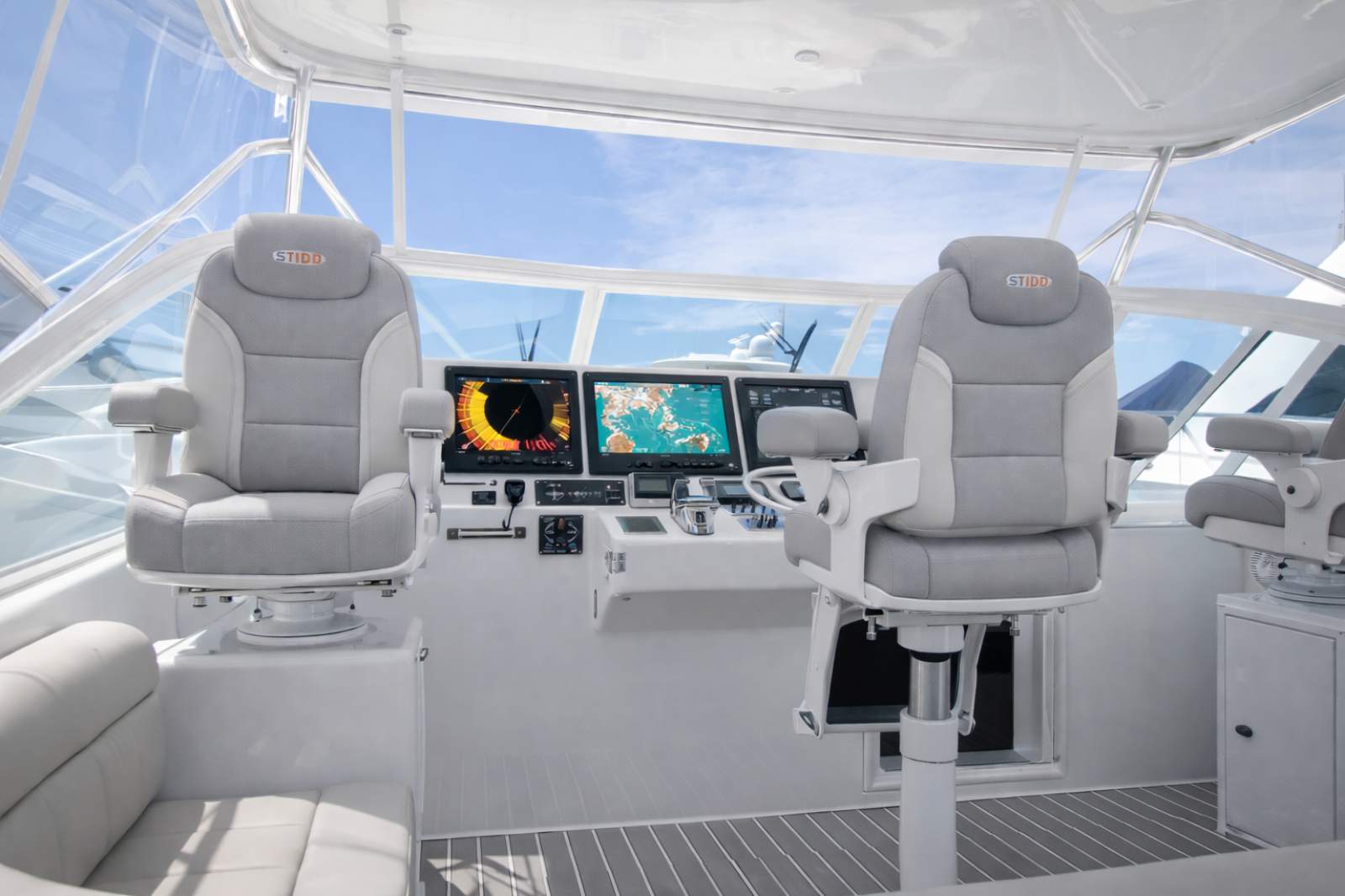 The oversized cockpit is the heart of this vessel. Designed for serious big-game fishing, it features: Deep coamings and wide gunwales for safety and leverage during heavy fights. Twin in-deck kill boxes and a high-capacity live-bait tank. Integrated rod holders, tackle storage, and cockpit freezer. Full-width transom door for easy fish landing and water access.