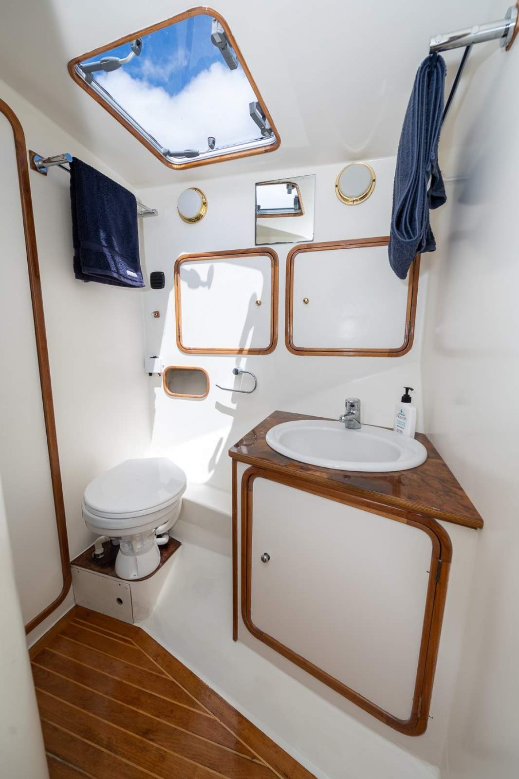 Two cabins, six berths, dual electric heads, and midship galley