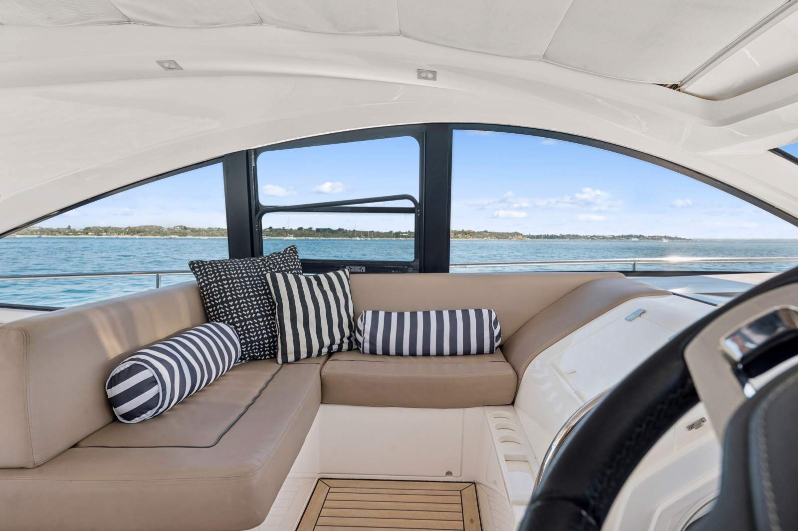 The cockpit is designed for entertaining, featuring ample seating, a beautifully finished table, and seamless flow between indoor and outdoor spaces.