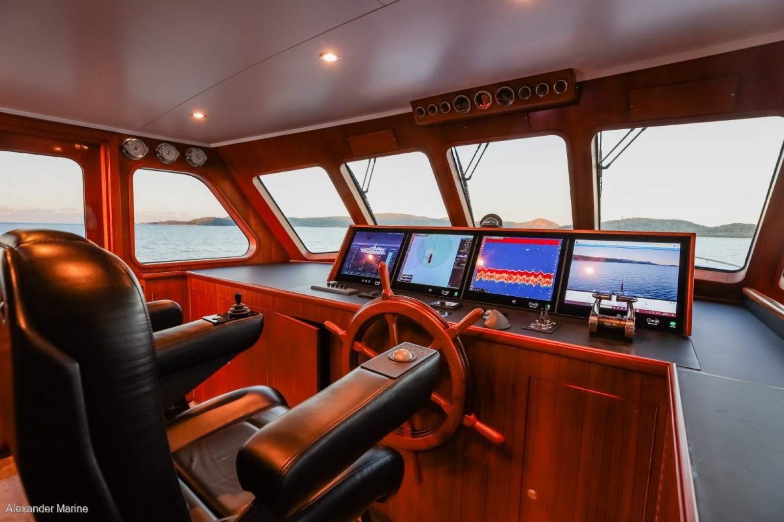 The interior reflects superyacht craftsmanship with satin teak joinery, high-quality custom furnishings and large glazing for natural light and ventilation. The saloon offers a lounge area, wet bar and entertainment cabinet with a Hi/Lo Samsung Frame TV, while the raised pilothouse features dual helm chairs, elevated guest seating and advanced navigation including radar, night vision and sonar systems. Docking is made effortless with hydraulic bow and stern thrusters and remote controls.