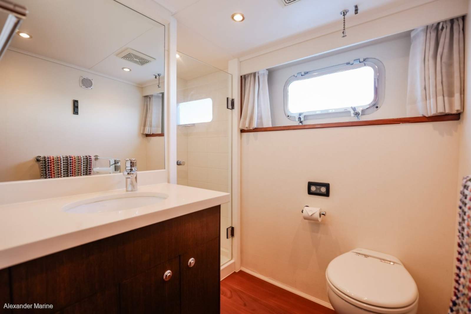 emergency exit) and portholes in the hull sides. The dedicated Captain's cabin features a king single bed, with private
