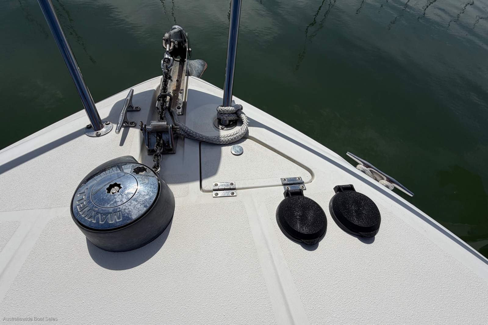 Swim platform with stainless steel safety rails, swim ladder, Stainless steel BBQ, gas bottle holder, transom locker, bait board, rocket launchers, outboard bracket, deck wash, esky nook, stainless steel bow rail, walk through windshield, fender baskets, remote spotlight, fenders and mooring lines.