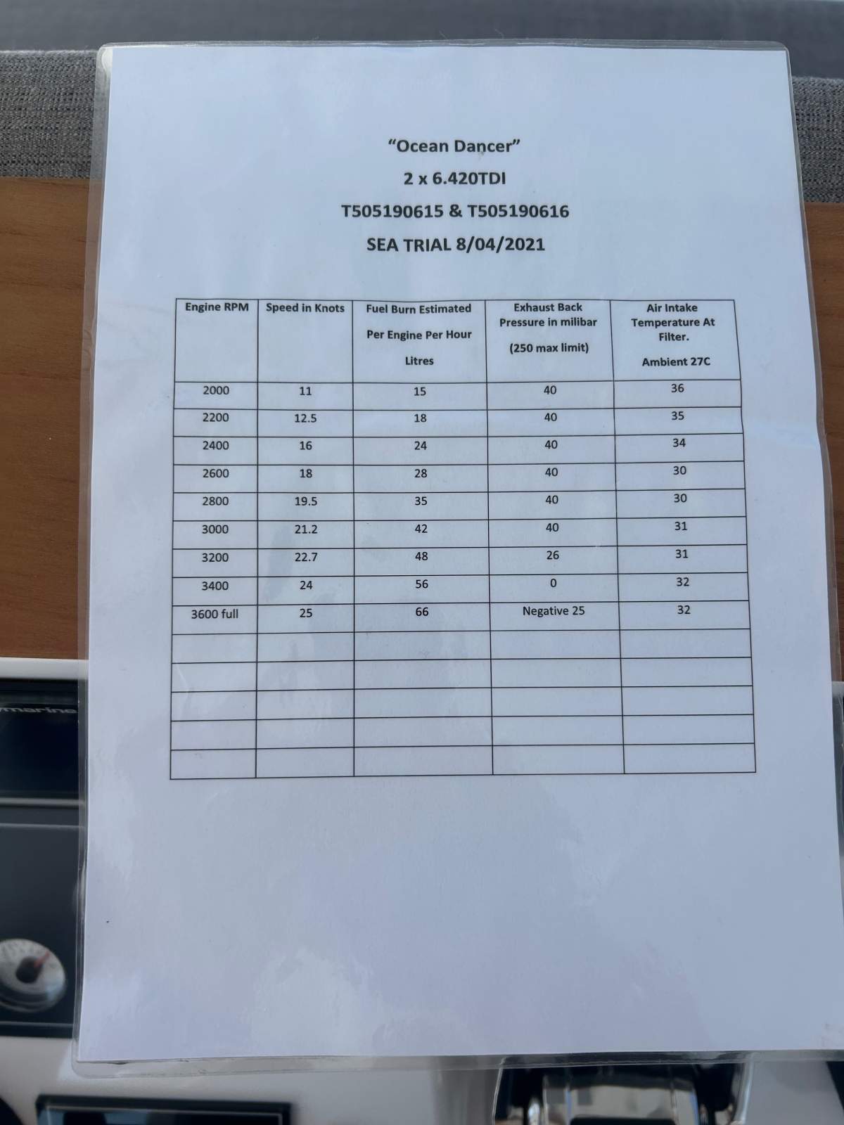 Fuel Consumption - 3 litres per nautical mile at 18/20 knots OR 60L combined diesel use per hour FYI