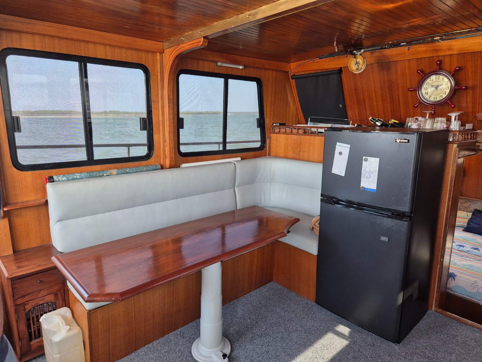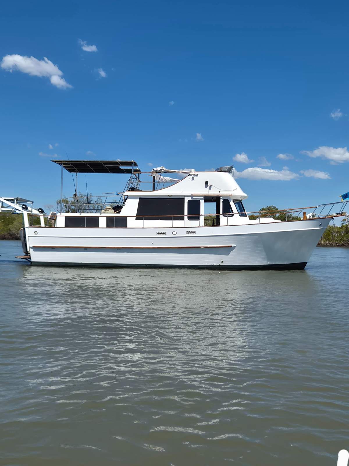 1984 Gold Island Aft Cabin Costal Cruiser. This 40ft boat is powered by 2 Volvo 165hp diesel motors cruising at 8knots at 2400 RPM. Maximum cruising is 3200RPM. Kubota generator powers the boat, hot water etc. Hot water heats from engine also. 12-volt electric winch. Two 12 volts bilge emergency pumps and one manual. Cruiser will sleep 6 with 2 front bunks, aft cabin queen suite and table in lounge coverts to double. Each engine has its own deep cycle battery, generator own battery, winch own battery. All batteries are independently recharged by 3 solar panels. Full shower and separate toilet in front cabin and toilet in aft cabin. Another back shower on deck. Full kitchen with Bushman 2 door fridge's 4 burner gas stove with grill and full oven. Fly bridge has full instruments and throttle. Seating is back-to-back, seating 8 comfortable. Sand and Plow anchors 45 meters of 10mm chain. Highfield dingy (2.9m) and new 5hp 4 stroke Parsun motor. This beautiful cruiser has been fully restored and is teak throughout. Great for someone that wants to live on board. This is my pride and joy but unfortunately age is catching up to us and it's time to let it go to a good home. You will fall in love with it.