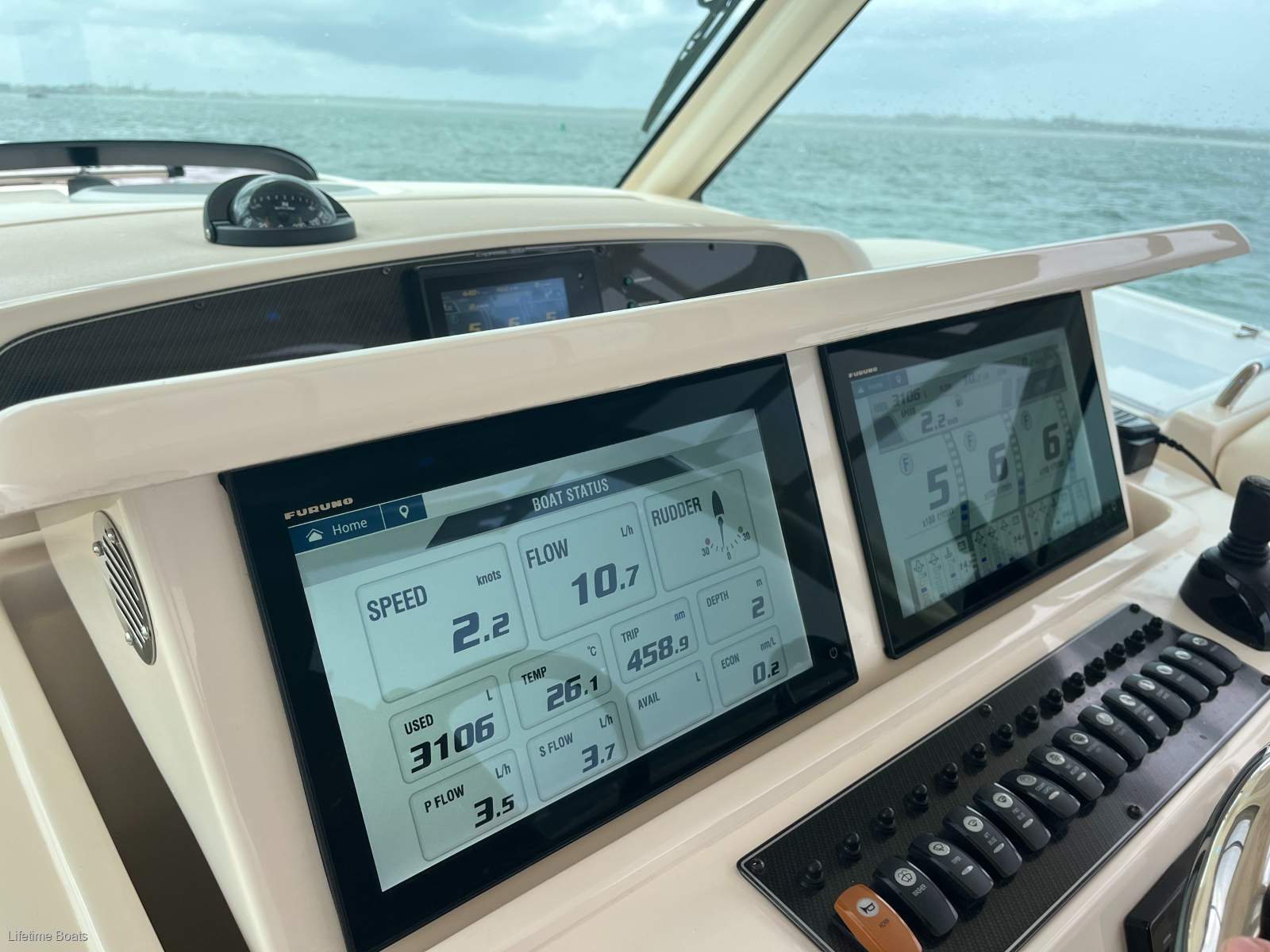 An extensive Furuno suite as added including, GPS8417 MFD / GMR Fantom 124 Radar, 120w 4' Open array, Reactor 40 Auto pilot, Yamaha Helm Master with GHC20/GNT 10 NMEA 2000 Transceiver, 315i VHF Marine radio, AIS800 Blackbox transceiver weith GA35 GPS antennae, Airmar R599LH Transducer, GSD26 Transducer processing module, GPS8410 to aft cabin connected to GPS, Cockpit camera, Thraine LT300 Iridium comms system, KVH Track Vision, TV1, KVH Tracphone V3 HTS, Flir M625CS Thermal camera, Compass, LED Navigation lights,