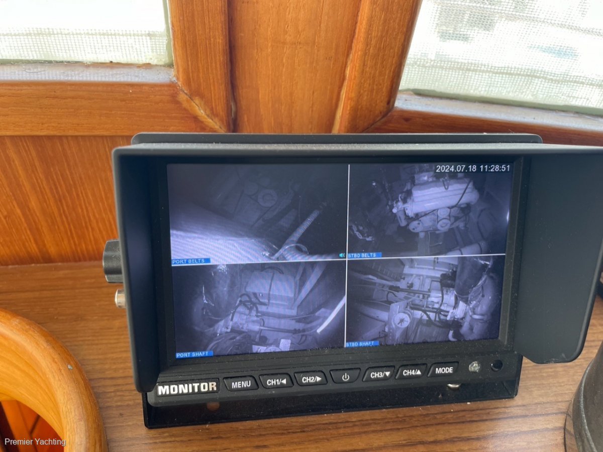 The fuel tanks were replaced with stainless steel tanks in 2021. While that was being done, both engines were removed and the cooling systems completely stripped and rebuilt to ensure longevity for the reliable 375hp Caterpillar 3208 engines. The engine room presents as new, and is monitored with 4 cameras. The Caterpillar engines and Onan genset have been meticulously serviced since the refit and have been totally reliable. The teak decks, both below and on the flybridge, were replaced at the time of the refit. A full suite of Raymarine instruments, including 12'' Hybridtouch screens, autopilot, AIS, Doppler radar and VHF radio, was installed at the same time. All instruments are duplicated at the flybridge helm. An aluminium hull AB rib with 10hp Tohatsu outboard is cradled on the aft deck with an electric Davit for easy launching and retrieval.