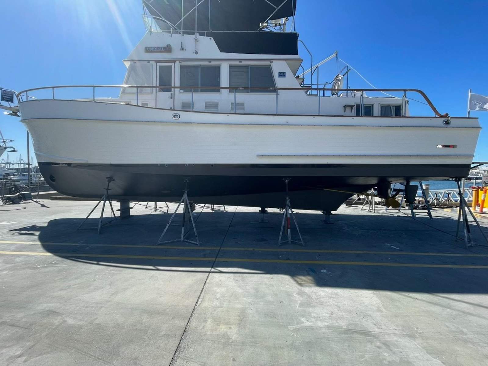 'Unreal' is a classic Grand Banks 46, with a huge saloon and flybridge, a large "V"berth in the forward cabin, forward head with full size shower and basin, aft cabin with double and single berths, hanging locker and huge storage, and aft ensuite. The galley is "down" on the port side, leaving the saloon open and airy, with an L shaped settee, two captains swivel chairs, two beautiful tub chairs, a wet bar with ice maker, and a wall mounted television over a roll door cabinet.