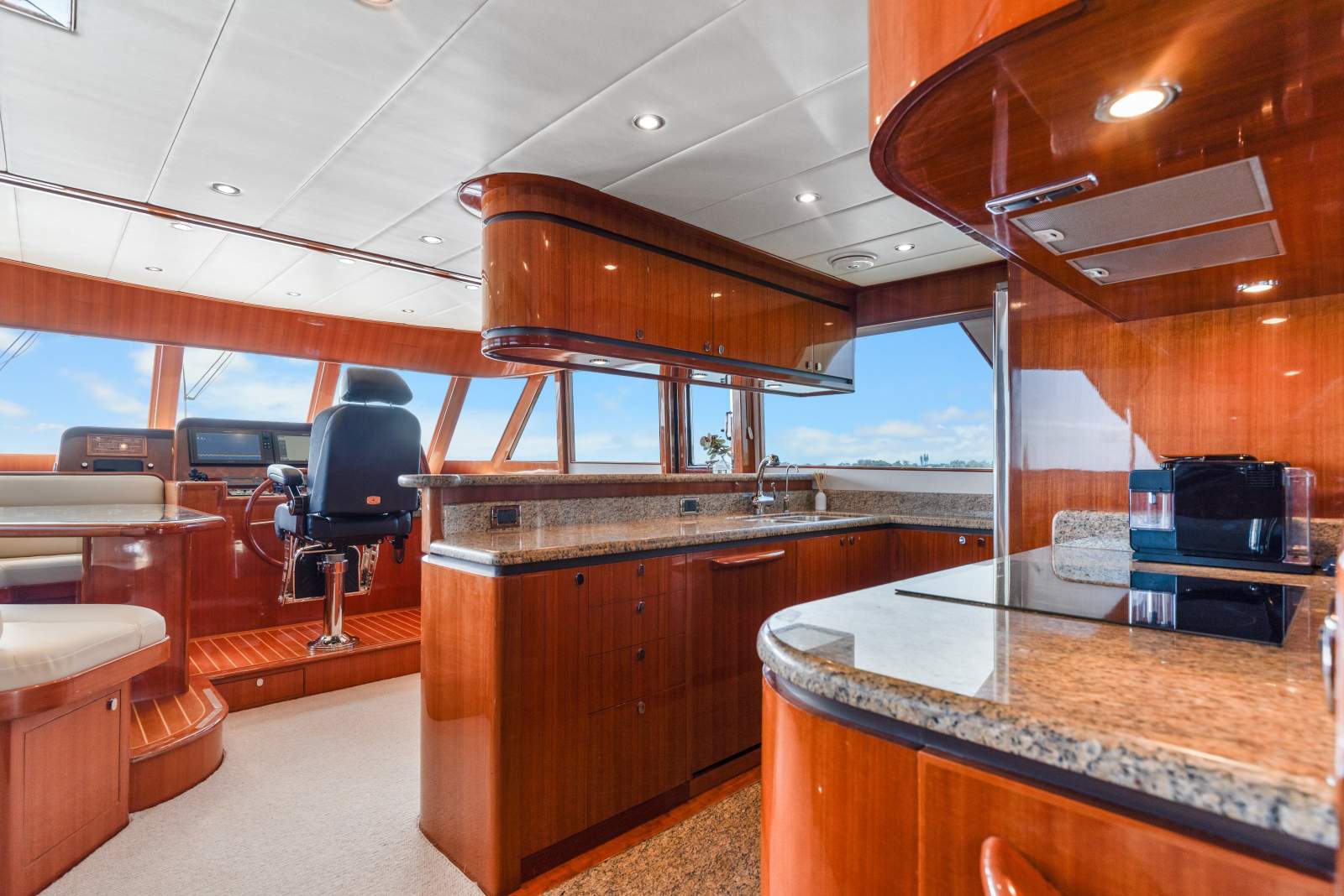 A few steps forward lead to the spacious galley and pilothouse area. The U-shaped galley to starboard is beautifully appointed with premium appliances, including a full-height LG fridge/freezer, Bosch electric cooktop and oven, Blanco microwave, and Asko dishwasher, everything required for extended cruising. Opposite to port, right adjacent the helm, a dinette area offers an internal setting for meals and somewhere to sit and keep the captain company.