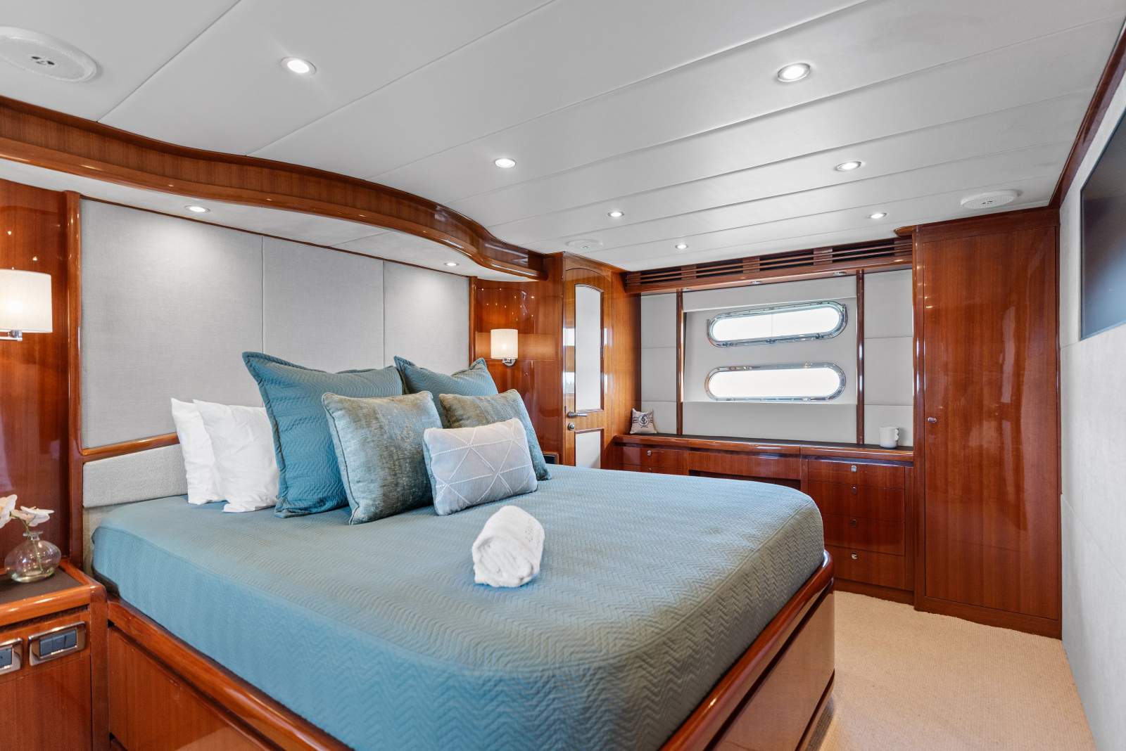 'Mahalo' accommodates up to eight guests in four beautifully appointed cabins. The full-beam master stateroom amidships offers a king-size bed, walk-in wardrobe, vanity, and a private ensuite. Forward, the VIP stateroom features a queen berth, while the two guest cabins provide flexible sleeping arrangements, one with side-by-side twin berths and the other with over-under bunks, perfect for family or additional guests. The fourth "crew" cabin is located under the cockpit sole.