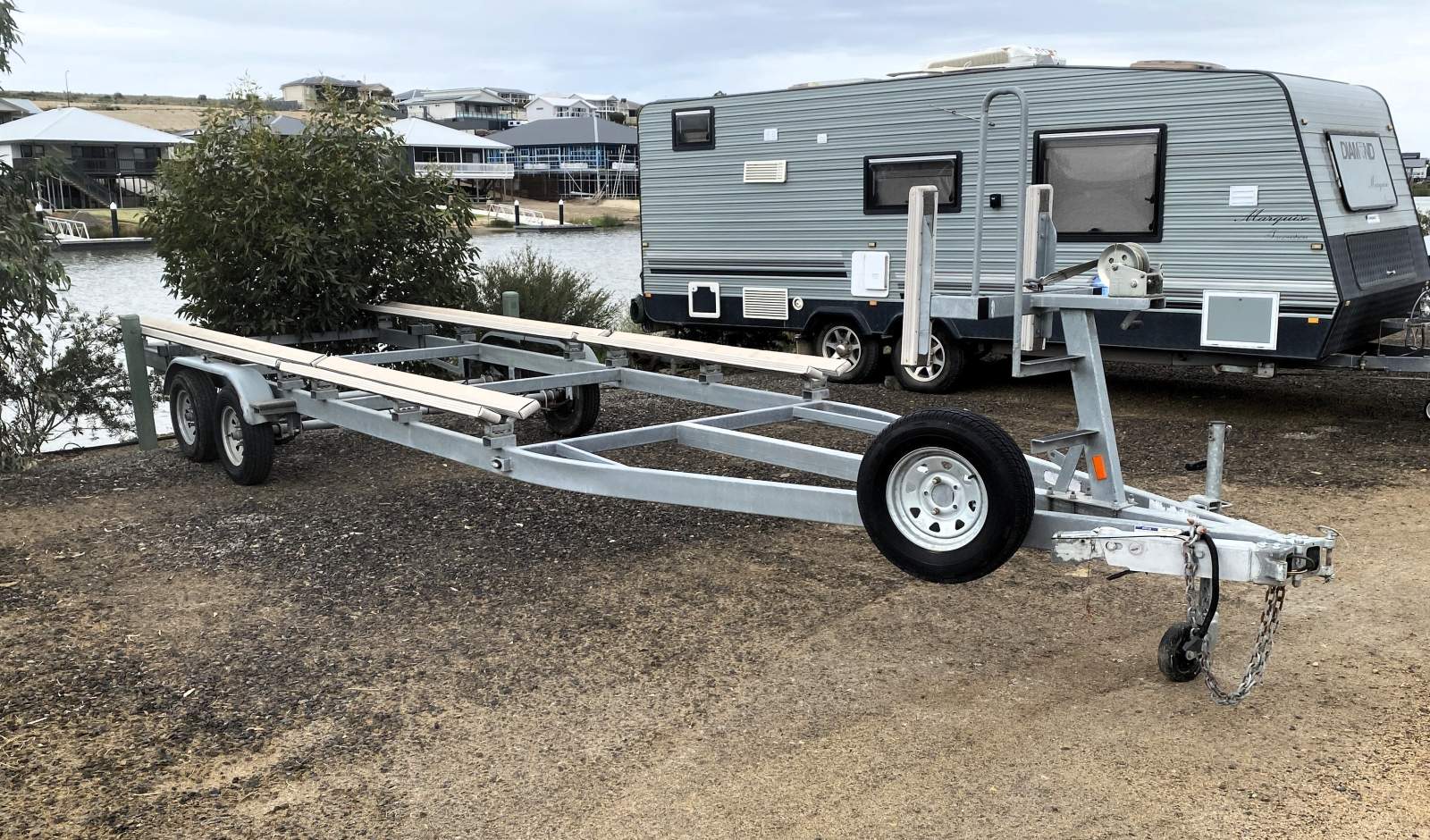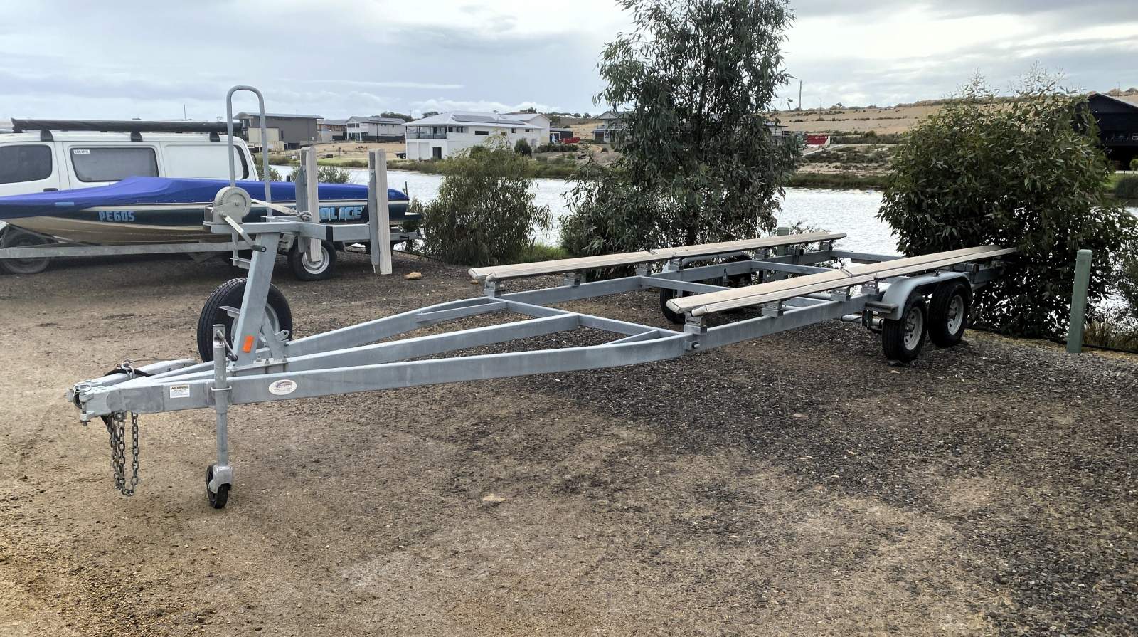 As per picture included is an as New, Factory tandem axle, galvanised trailer, with four x electric disc brakes, winch, spare wheel, and swing away drawbar.