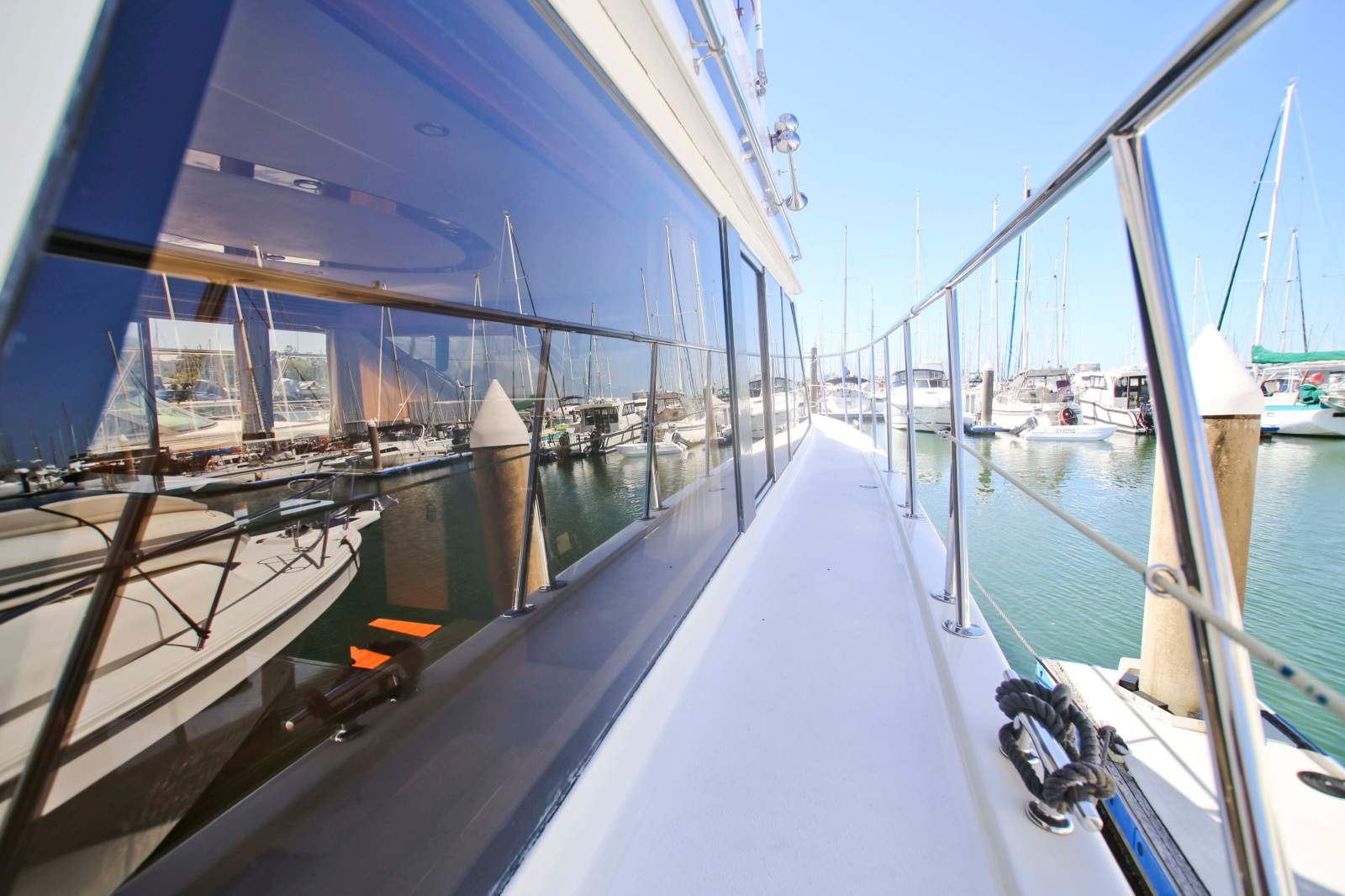 Accommodation forward consists of a twin bunk cabin with porthole for light and air and a pullman style double berth in the bow, both served by the day head which has a toilet, vanity and full standing room separate shower cubicle. At the other end of the boat with complete privacy is the master cabin with a full size walk-around queen bed and its own en-suite bathroom, dressing table and built in TV cabinet which also hides a washer / dryer. The feel throughout is like that of a quality hotel room with luxury touches and finely finished timberwork, mirrors aplenty and sliding screens covering the portholes if so desired.