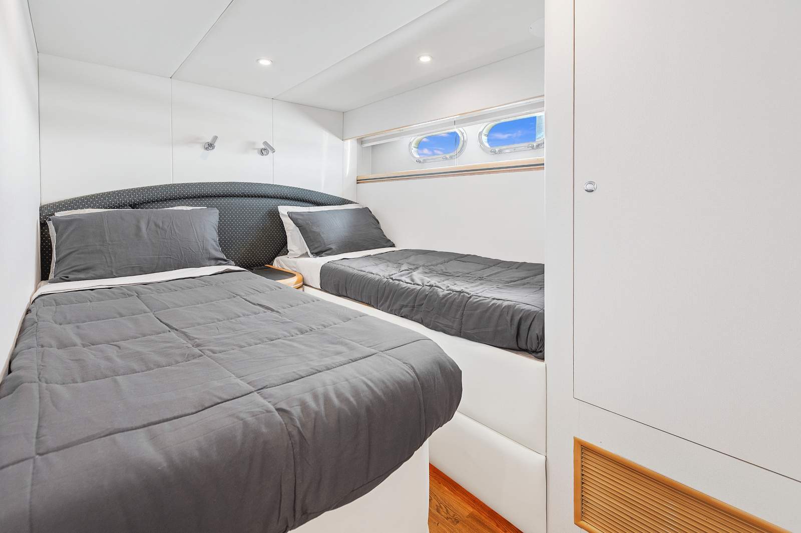 Midship master, Forward VIP double, Port double, Aft cabin twin singles