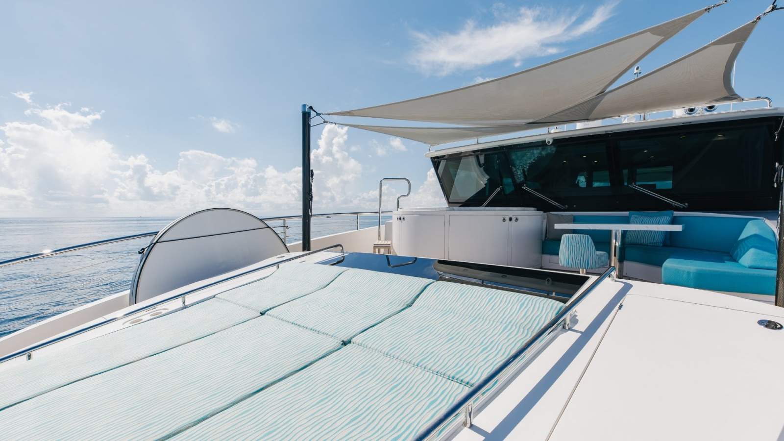 Aft of the enclosed skylounge, the bridge deck aft was customised for versatility and social use. In addition to tender/jet ski storage, the area features custom L-shaped settee seating with adjustable table, a full-service wet bar, ice maker, and a high-end BBQ grill--ideal for al fresco dining and sunset cocktails.