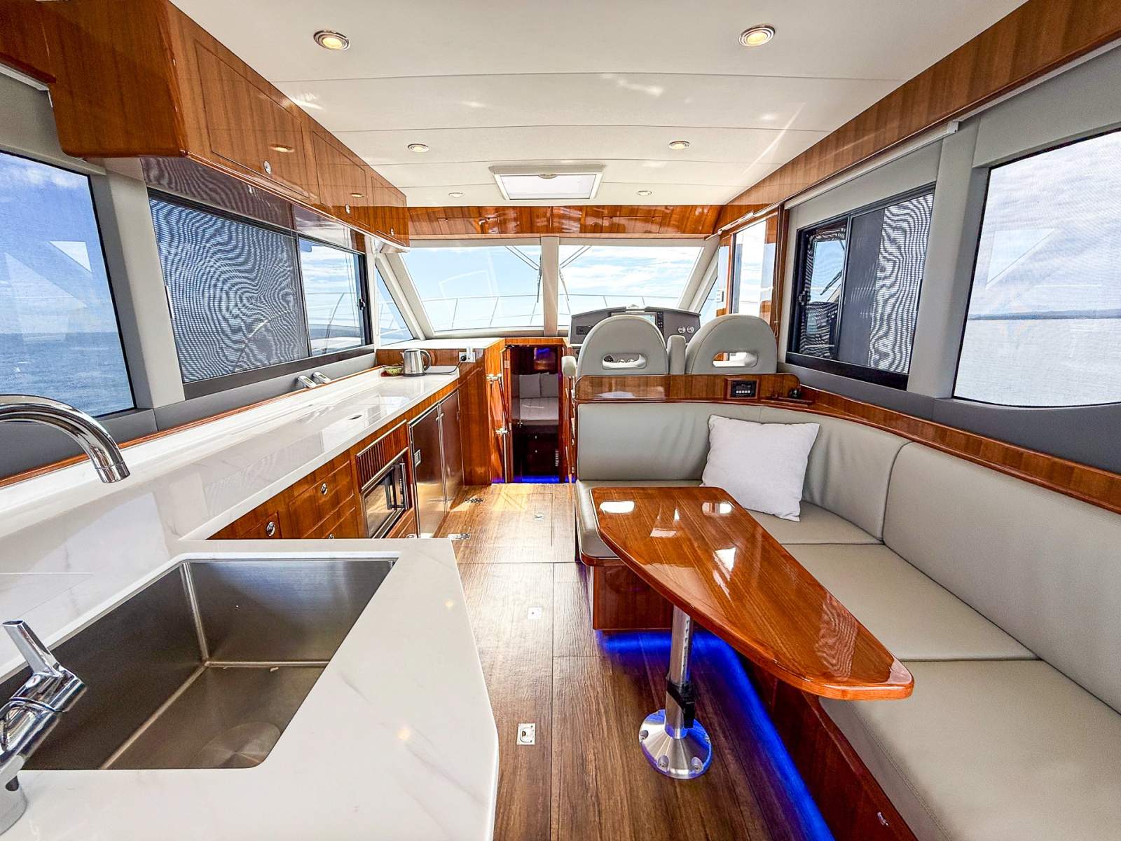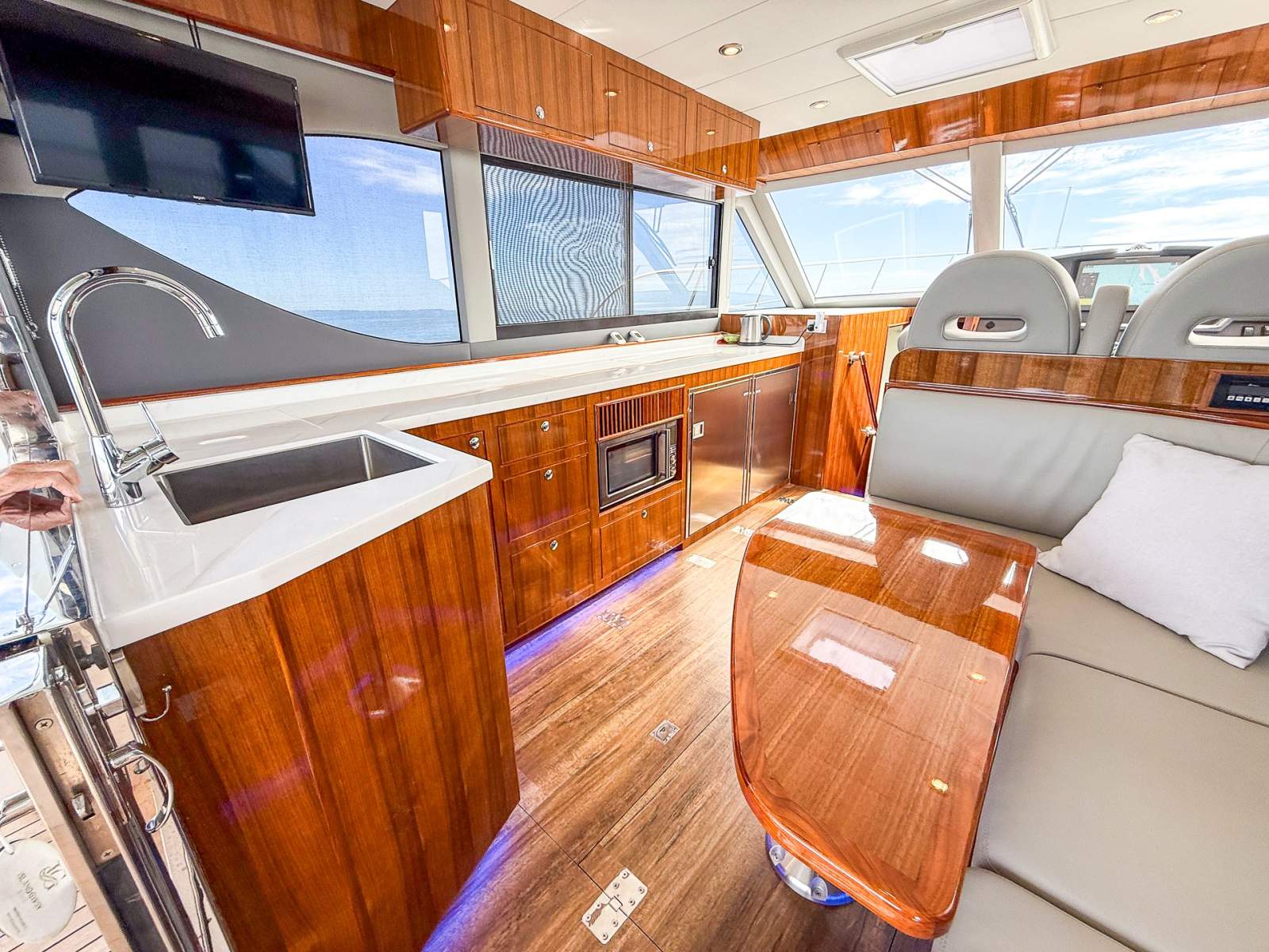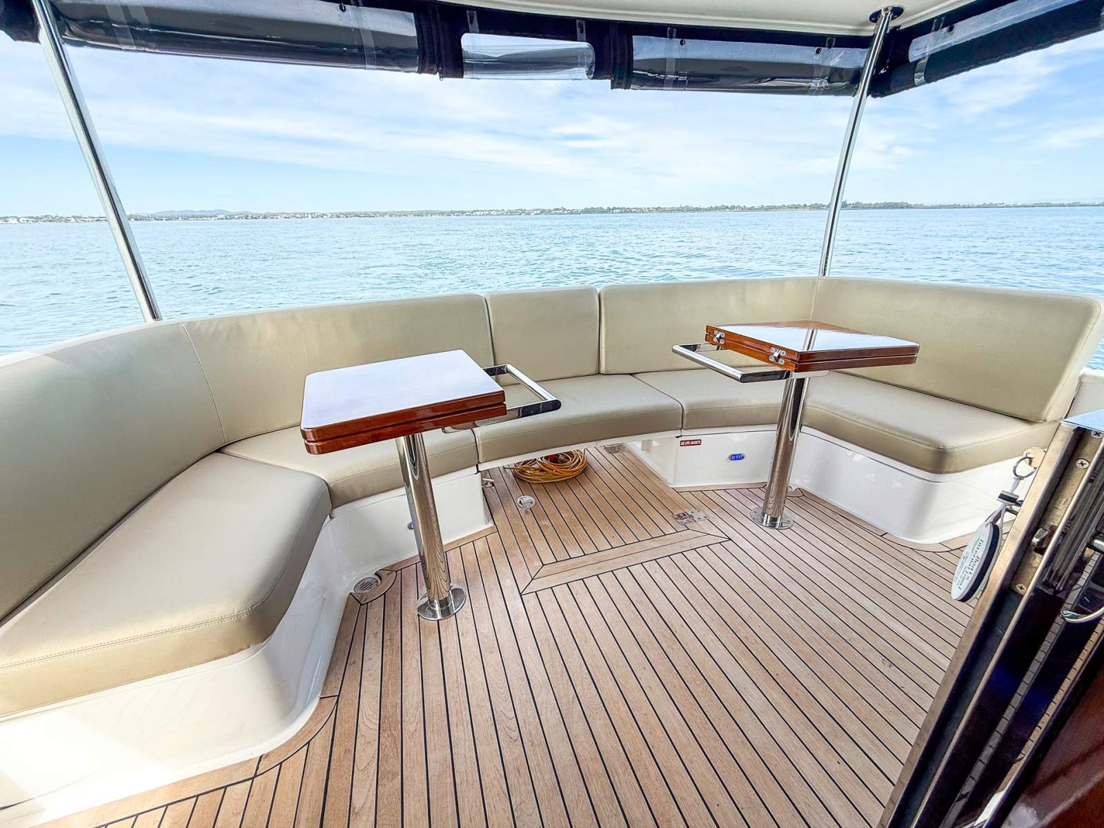 Her thoughtfully designed open-plan interior showcases high-gloss walnut cabinetry complemented by soft beige leather upholstery, creating a warm yet sophisticated ambience. A stainless-steel saloon door and hopper window open wide to seamlessly connect the saloon and cockpit, enhancing the indoor-outdoor lifestyle. The cockpit is perfectly set up for entertaining, featuring a generous U-shaped lounge, a folding table, and effortless access to the expansive swim platform.