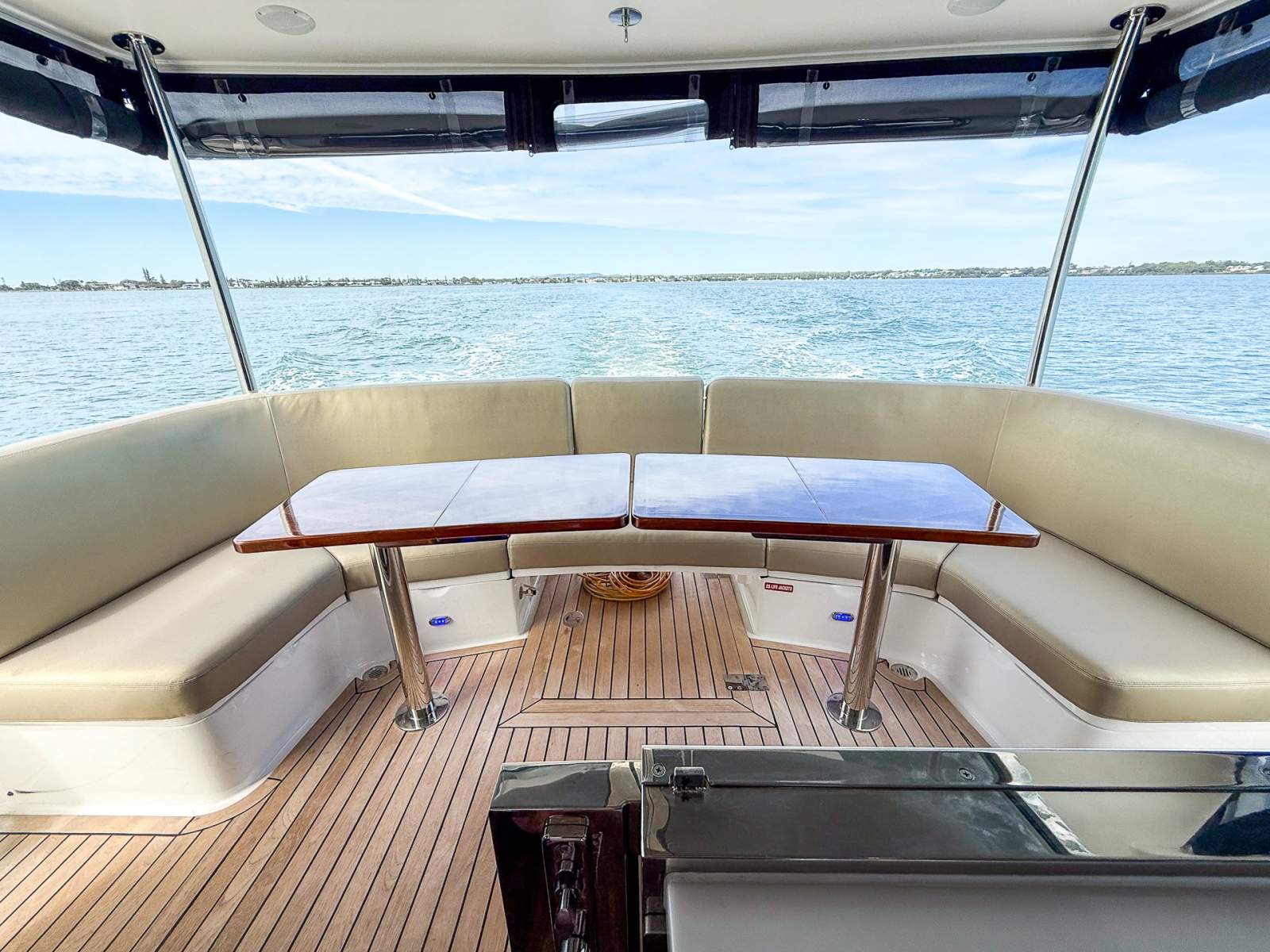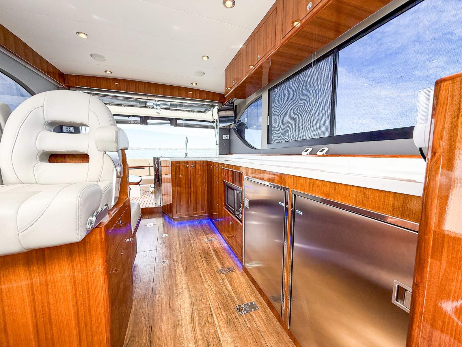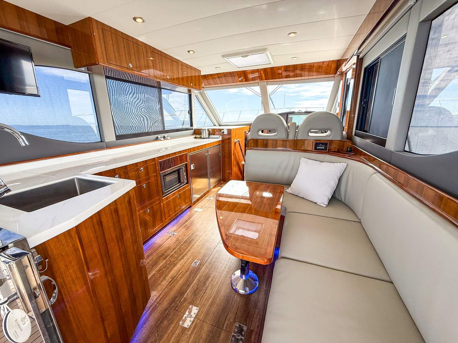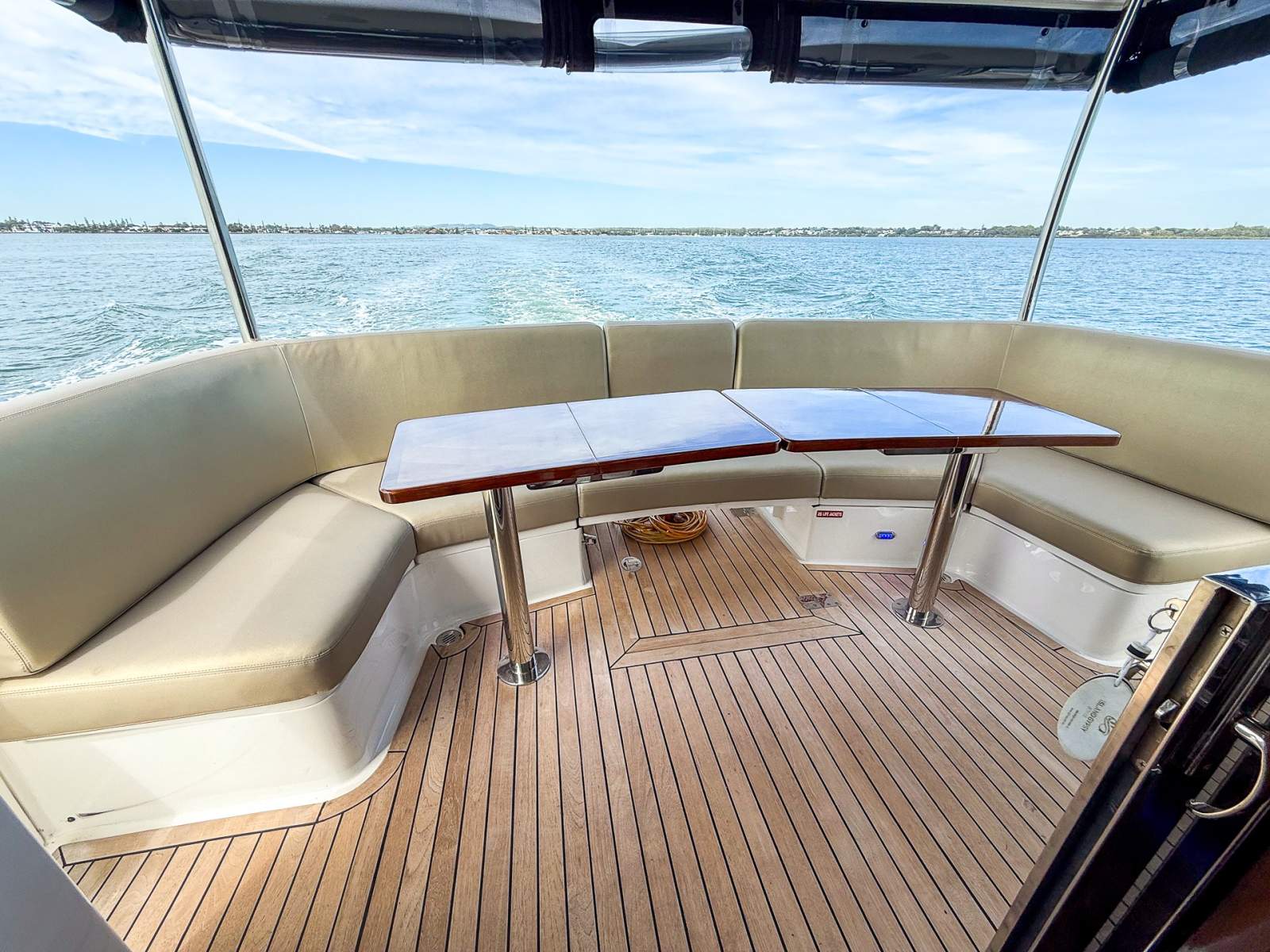 Her thoughtfully designed open-plan interior showcases high-gloss walnut cabinetry complemented by soft beige leather upholstery, creating a warm yet sophisticated ambience. A stainless-steel saloon door and hopper window open wide to seamlessly connect the saloon and cockpit, enhancing the indoor-outdoor lifestyle. The cockpit is perfectly set up for entertaining, featuring a generous U-shaped lounge, a folding table, and effortless access to the expansive swim platform.
