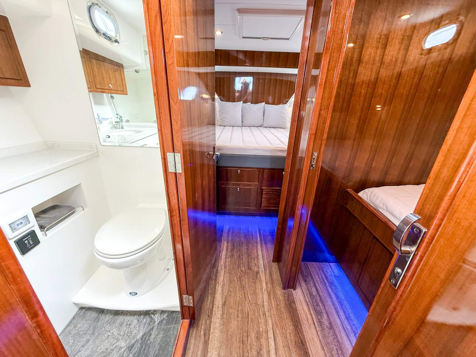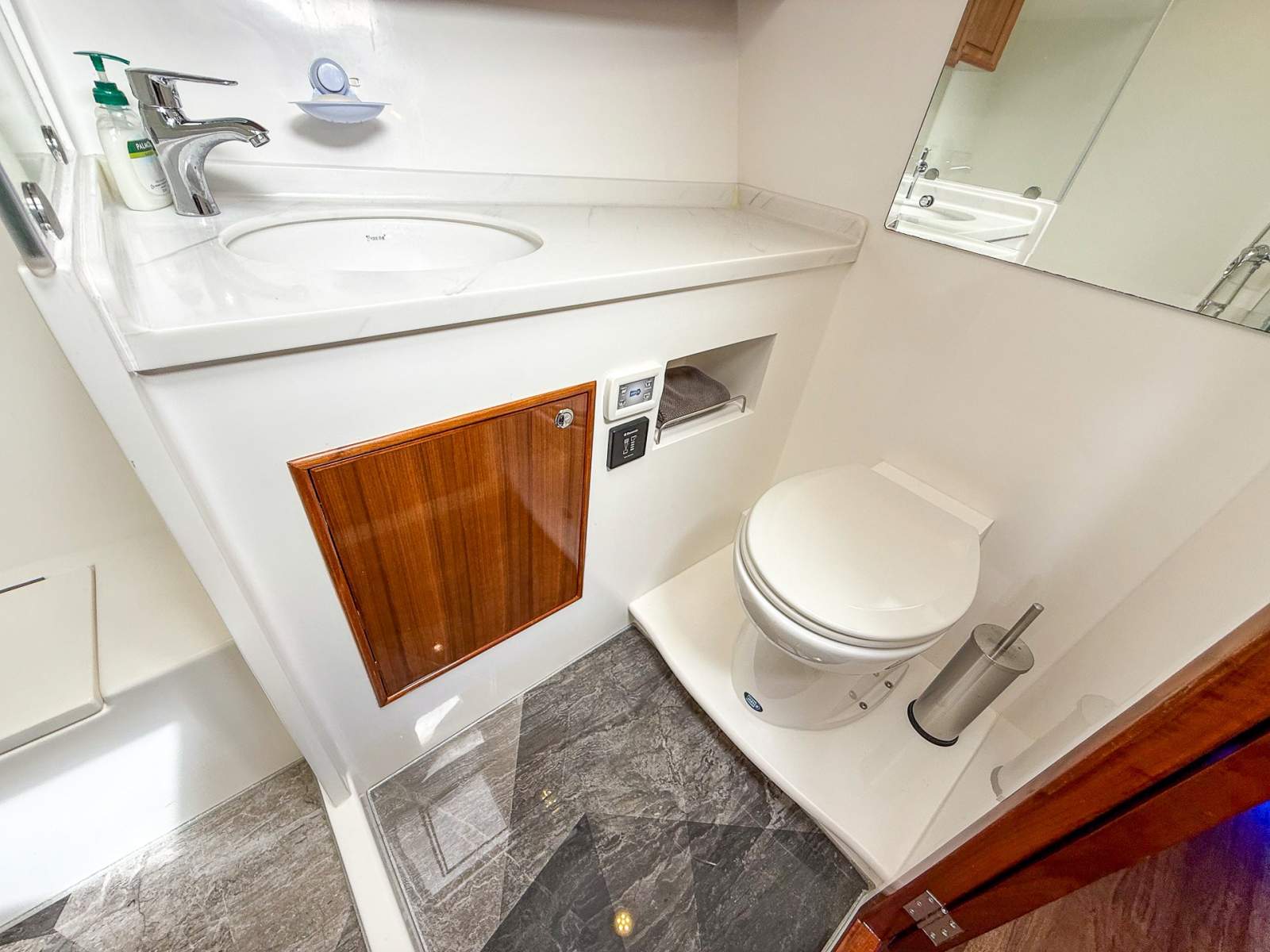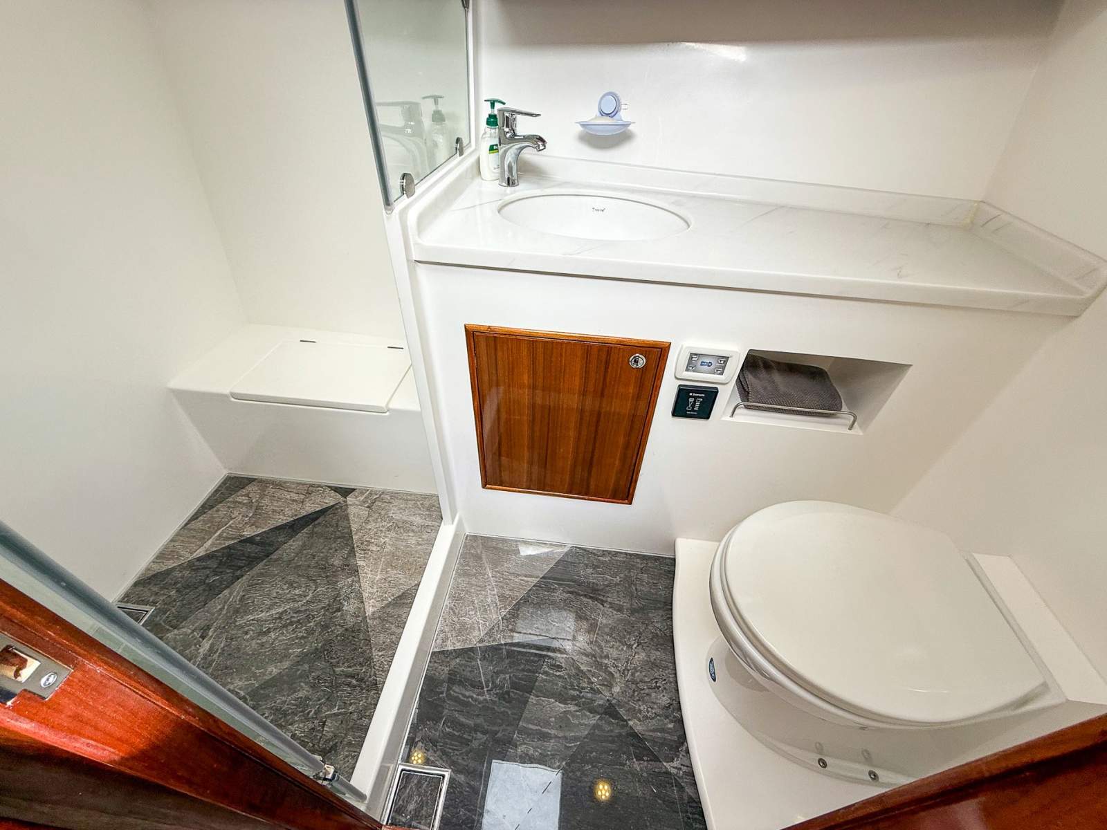 There are two cabins available: one with a queen bed and one with a double bed, along with a convertible dinette, accommodating a total of six berths. Both cabins and the saloon are air-conditioned for year-round comfort. The single head features an electric toilet and a surprisingly spacious separate shower stall.
