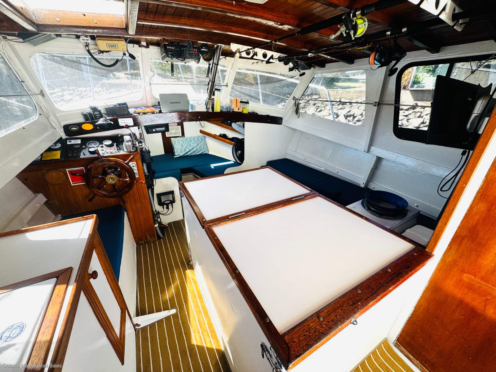Raymarine autopilot, Garmin plotter/sounder, GME VHF.