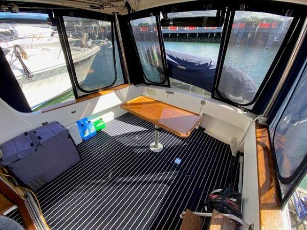 Her accommodation includes a roomy forward V-berth (with infill) and a convertible saloon dinette, providing berths for up to four. The galley is integrated into the saloon and features 12V refrigeration and a gas cooktop. Additional features include a marine hot water system, electric toilet with holding tank, solar charging, new windlass, cockpit hard top with quality covers all around, tender, and walk-through transom access to the swim platform. A very well presented, ready-to-enjoy sedan cruiser ideal for the Gold Coast waterways or exploring Moreton Bay.