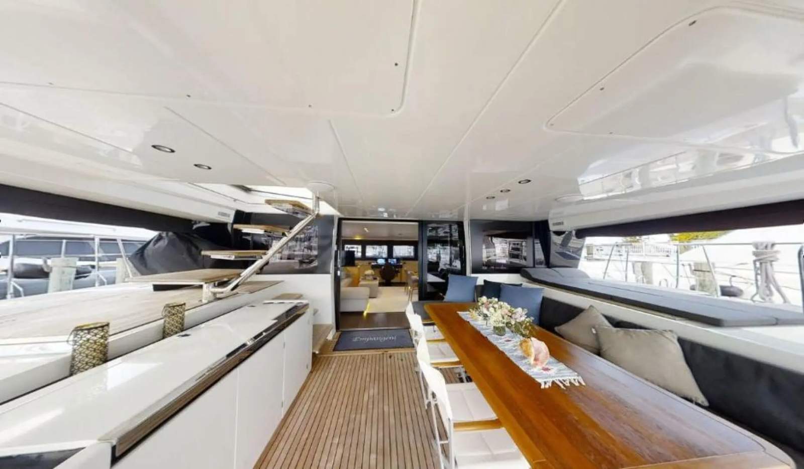 Teak flybridge and sunlounger pads (dark gray cushions)