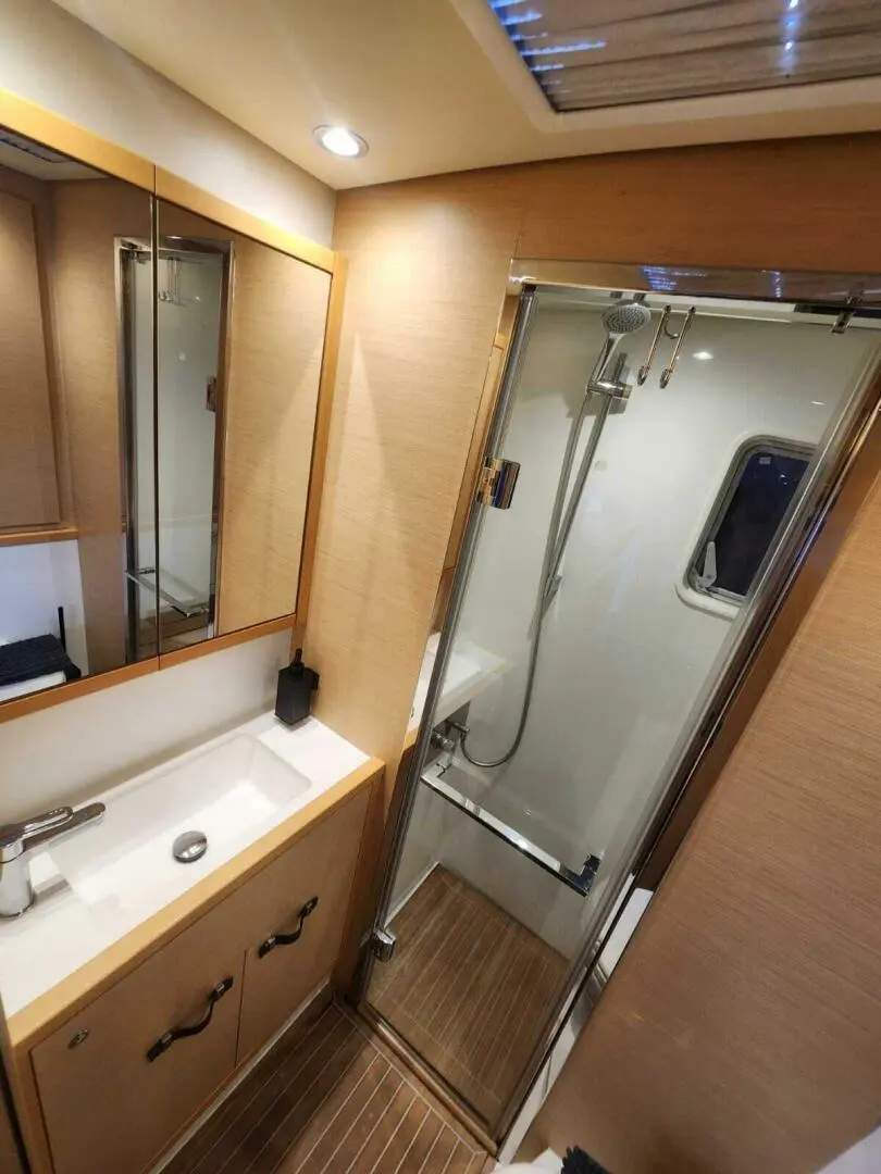 Equipped with the upgraded Volvo Penta D4-300 engines, joystick steering for effortless docking and controls at both helms as well as the Nav station in the salon that enables the skipper to navigate out of the elements on extended cruises. The upgraded long-range fuel capacity of 5,000 liters (1,321 US gallons) offers an impressive range of approximately 4,800 nautical miles at an optimal cruising speed of 6 knots, or 3,300 nautical miles at 8 knots. With a fresh water capacity of 960 liters (254 US gallons) and a 280L/h (74 US Gal/h) watermaker on board, this vessel is perfectly suited for extended transoceanic voyages, combining power, efficiency, and ample tankage for long-distance cruising.