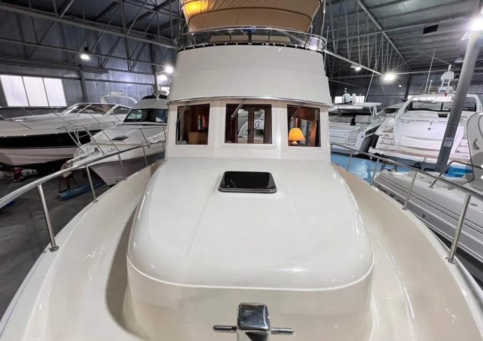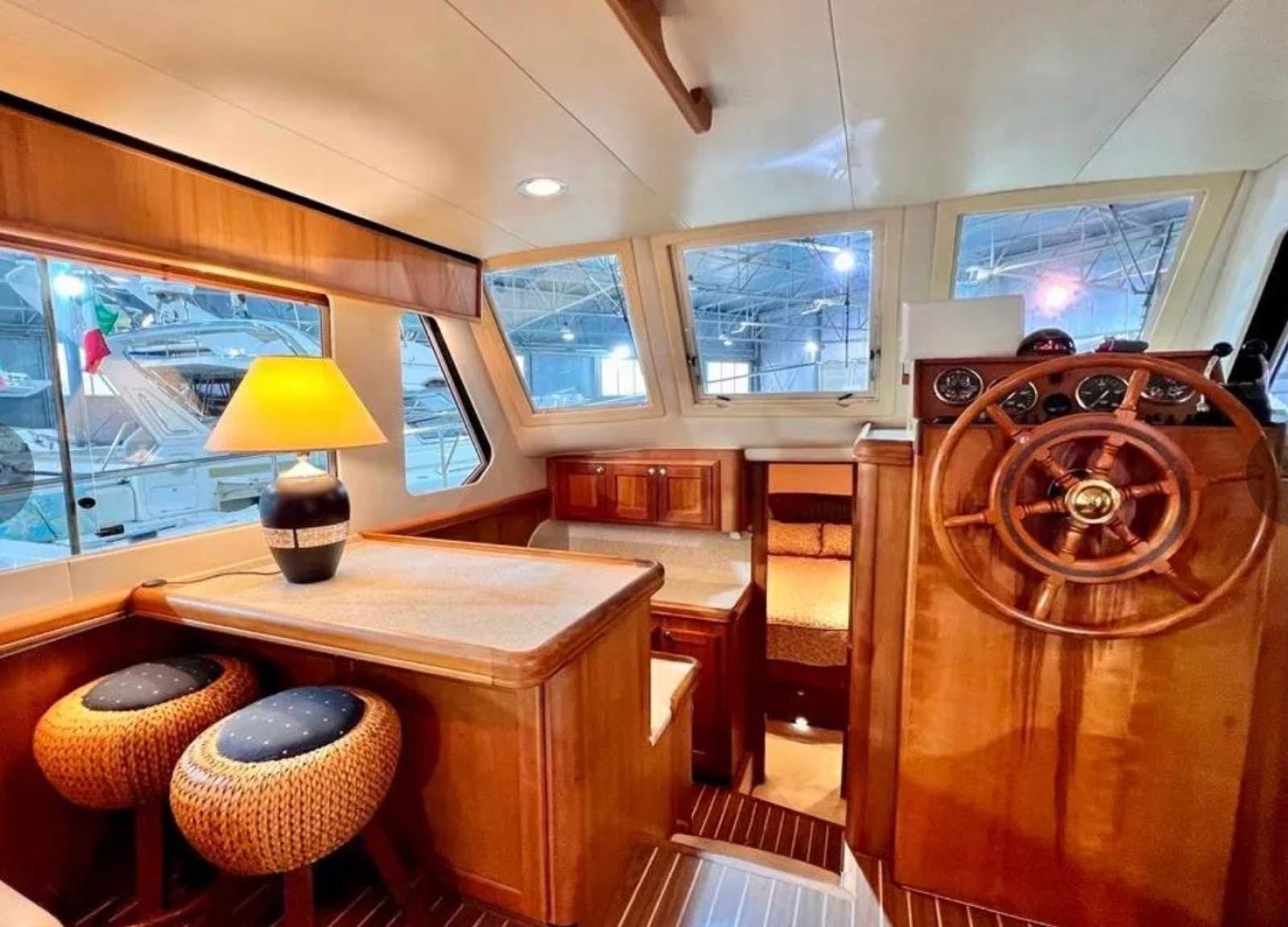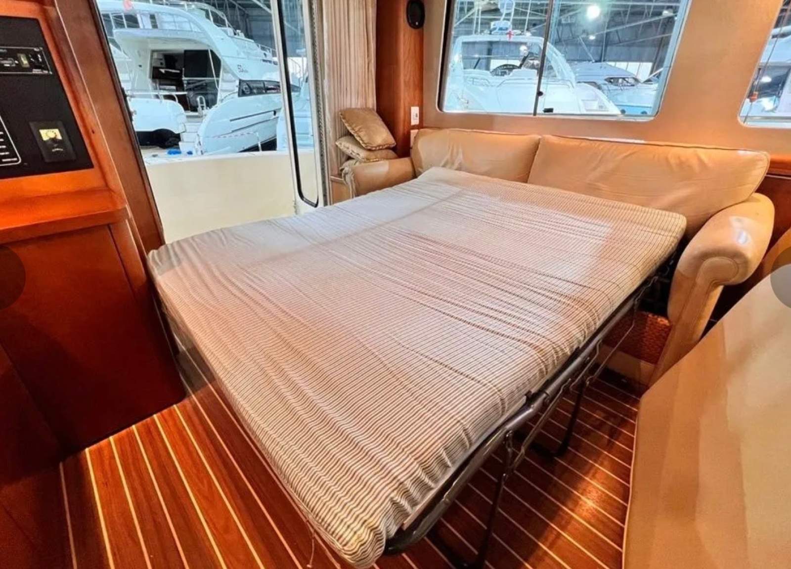This twin engined trawler is built on a semi displacement hull that features a full keel.