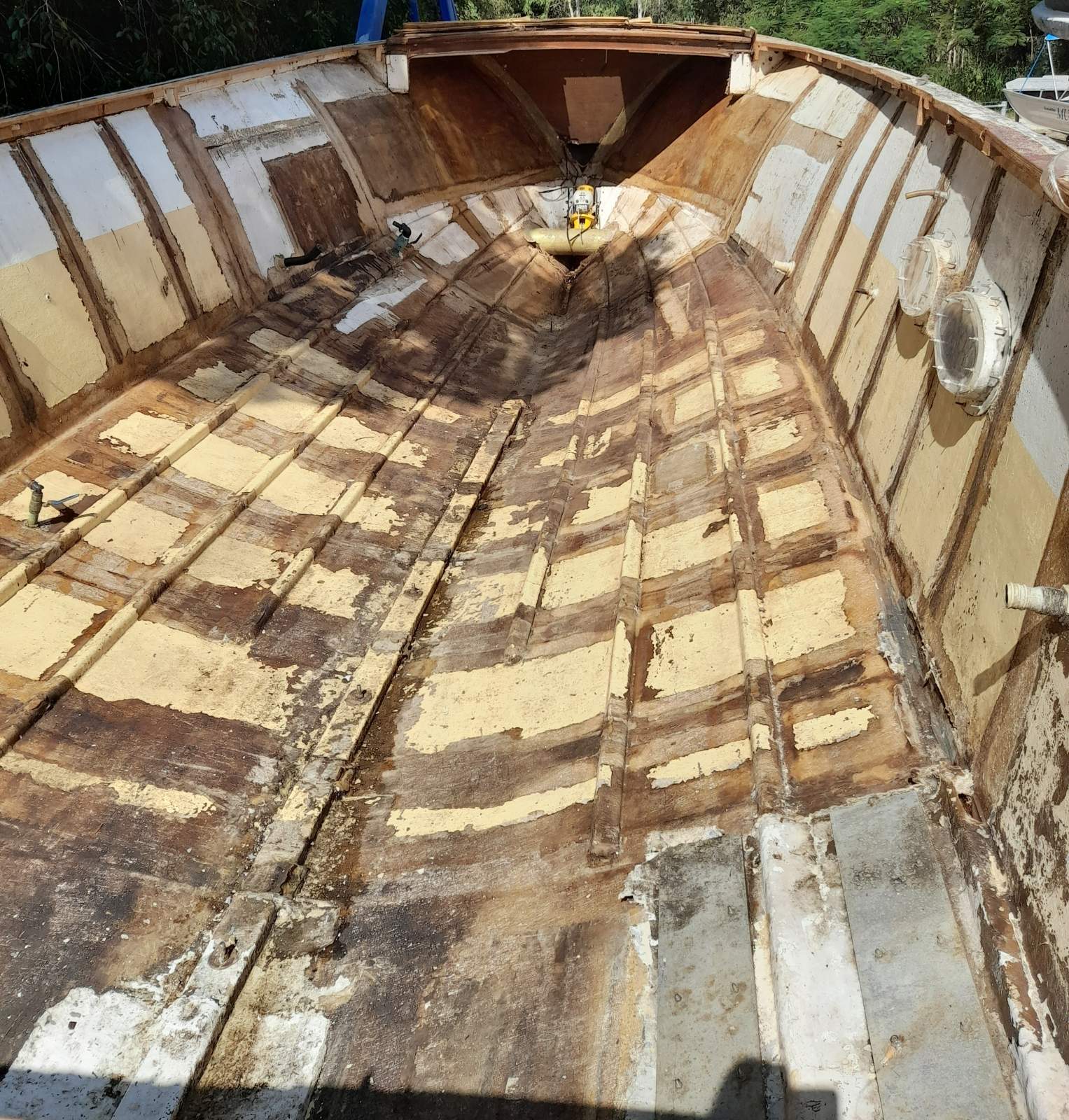 Mariner 34 Hull Only. Solid Fibreglass with Bow Thruster Tunnel. Rebuild to Original or Convert to Large Centre Consol, Houseboat etc. Great flared bow.