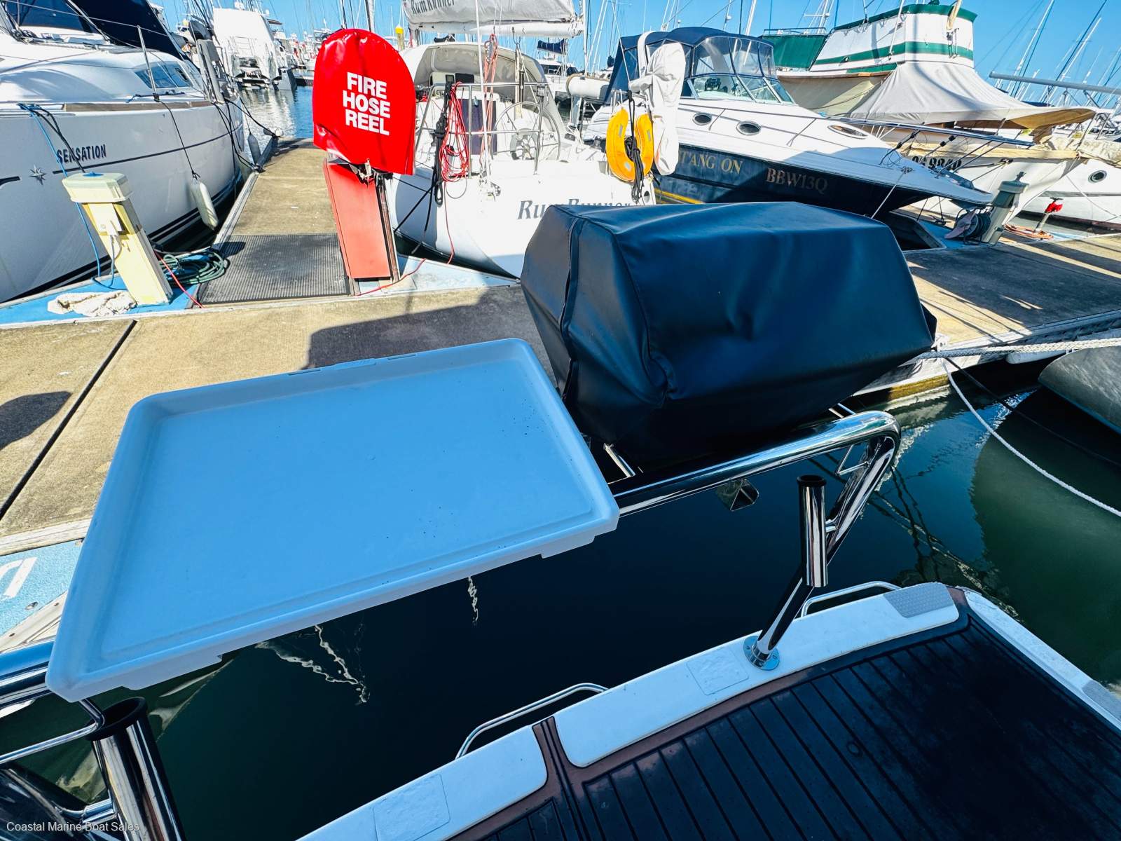 AFT DECK - Good sized with room to entertain, 12v fridge, marlin door all accessing the large duckboard with cookout BBQ (has fibreglass gas bottle), ladder and baitboard.