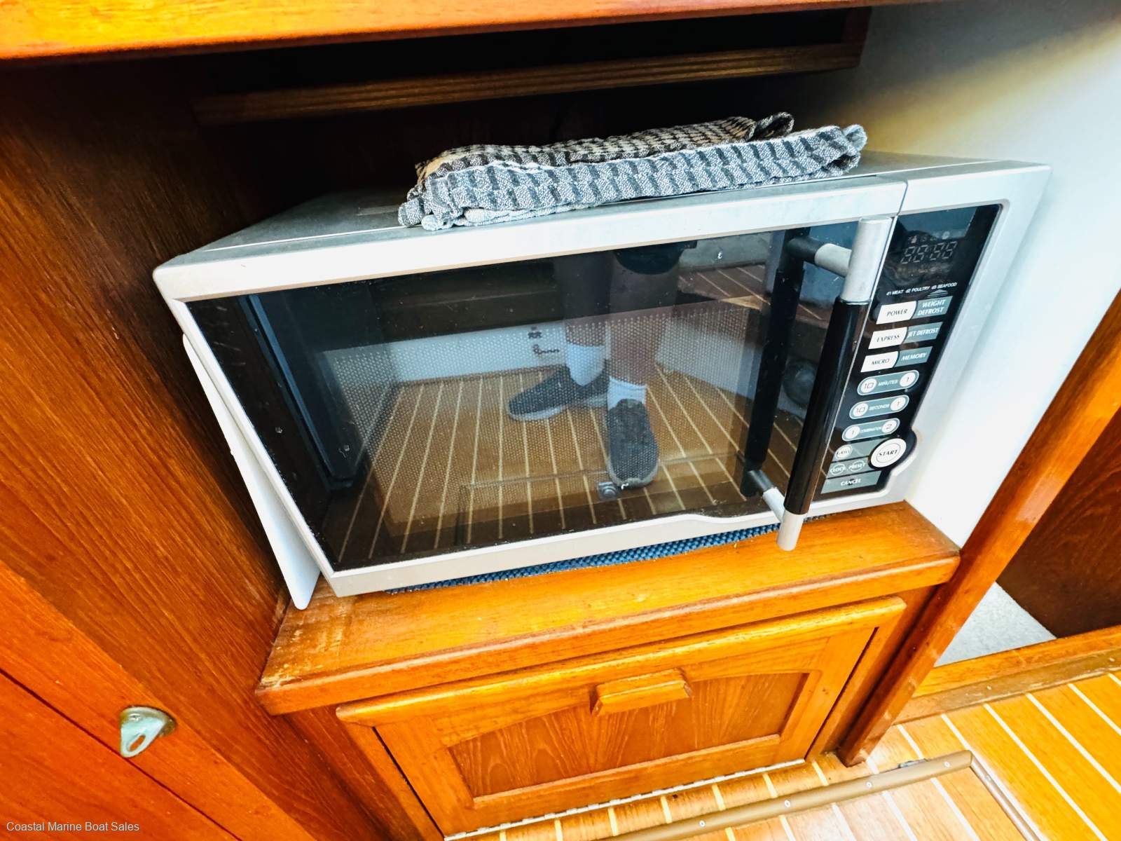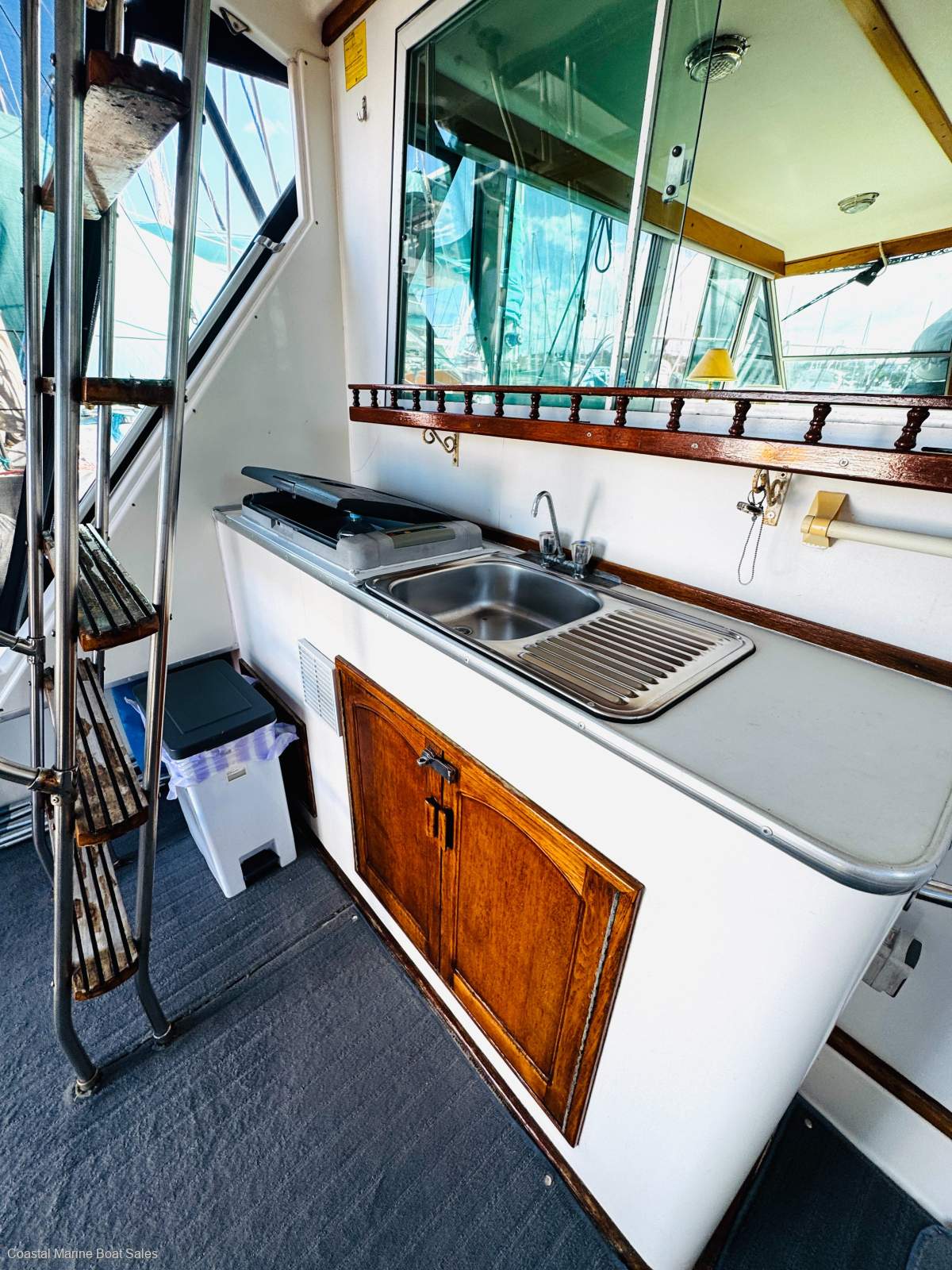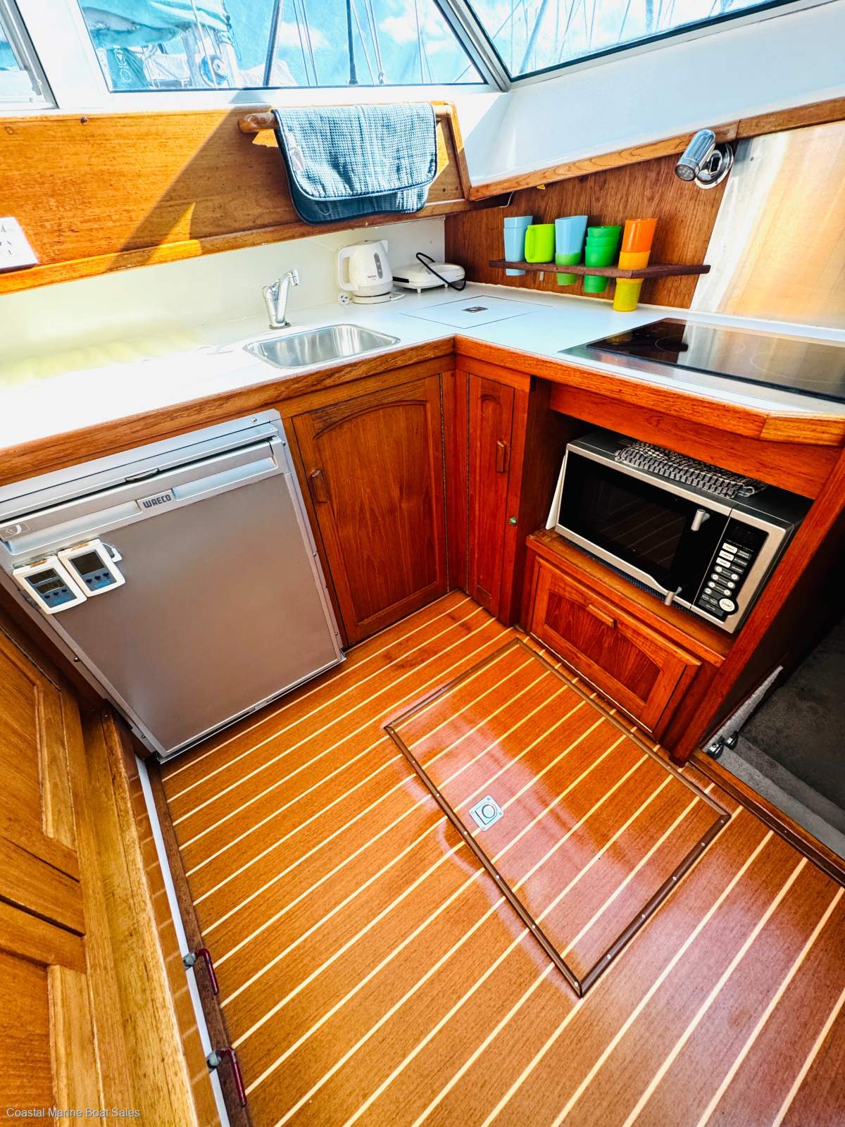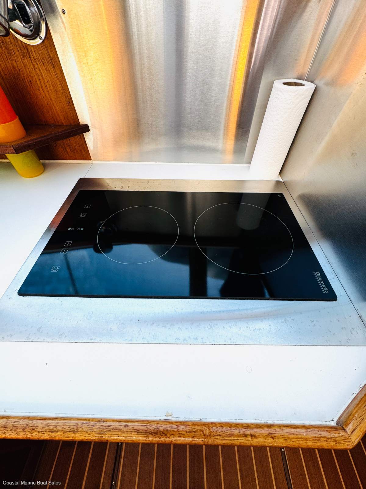 U shaped galley in the mid ships complete with 2 burner electric stove, 12v fridge, 12v freezer under floor, microwave, sink and lots of storage.