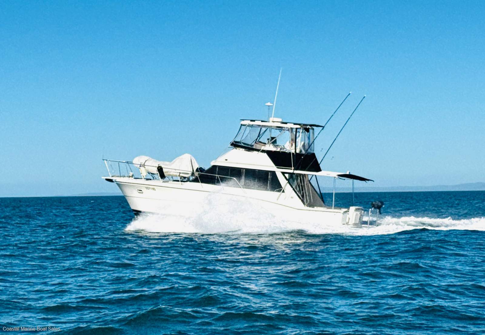 "Moonlighting" offers her owners a large saloon with a beautiful timber dinette with large L shaped seating on 3 sides. The fully galley is ready to cook up a feast with sink, convection microwave, 2 burner electric cooktop and 12v fridges and freezer. A master stateroom in the bow with walk around island bed. On the starboard side is the second cabin with 2 good sized bunk beds, both accessing the well appointed bathroom with electric toilet, shower and basin. On the outside this beautiful vessel has it all, large flybridge with full clears, two like new helm chairs, Raymarine electronics and room for many, also off the flybridge is access to the rear hardtop which is perfect for relaxing on with a couple of lounges, this also provides shade for the rear deck.